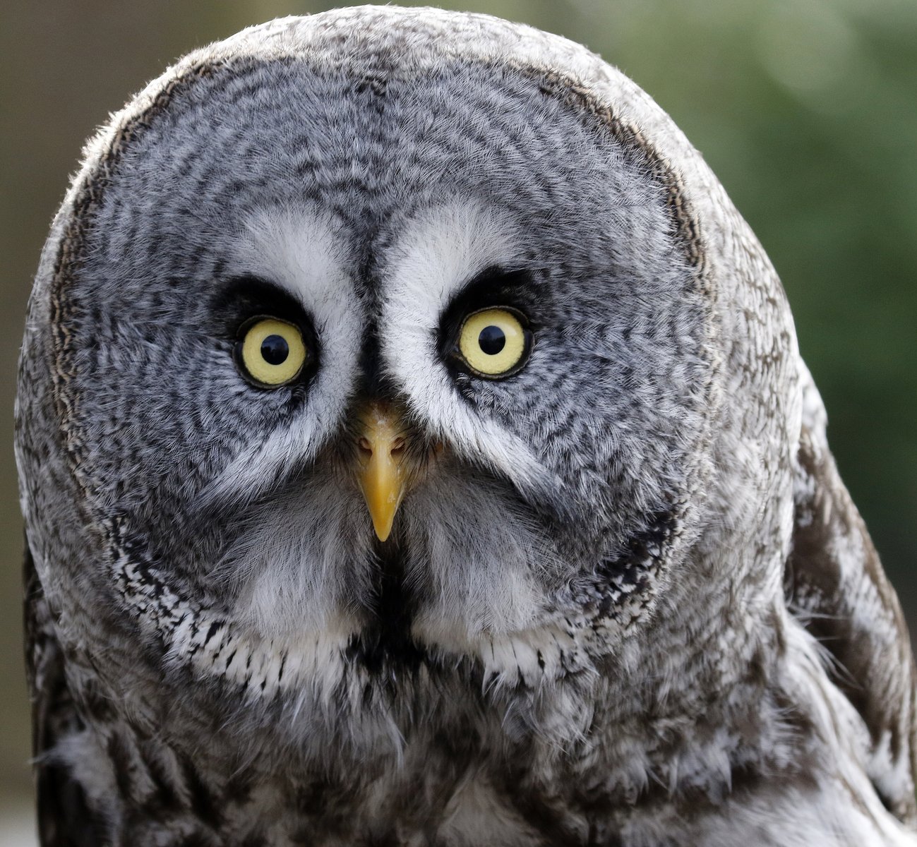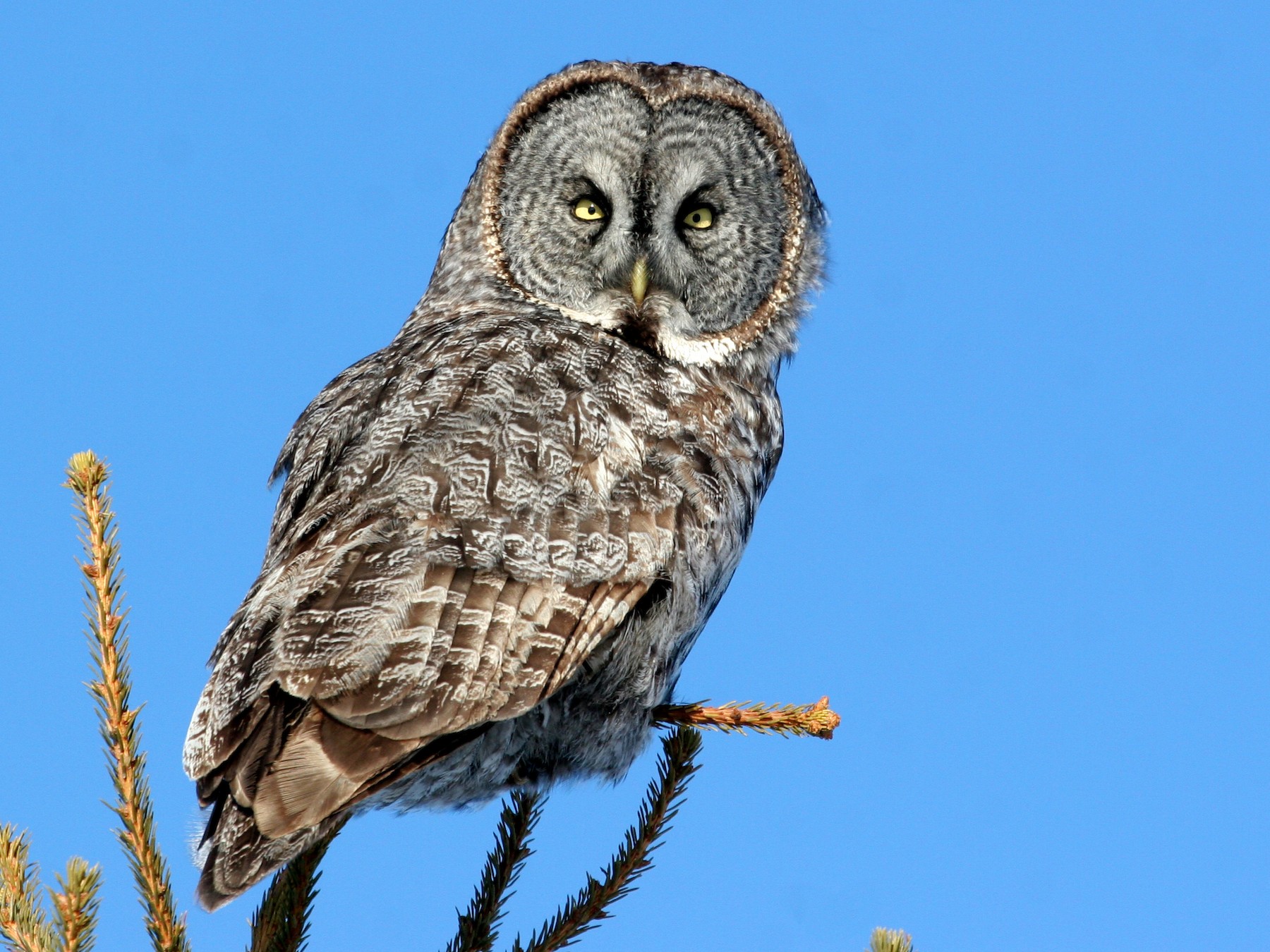 '큰회색올빼미'는 전체 길이 57~80cm의 대형 올빼미로, 특히 머리가 둥글고 커서 머리둘레가 51cm나 된다. 얼굴에는 여러 겹의 갈색 동심원 모양의 무늬가 보이며, 얼굴 크기에 비해 눈이 작아 보인다. 눈과 눈 사이에 X자로 난 흰 깃털이 눈에 띈다. 북미에서부터 유라시아 대륙의 삼림 지대에 널리 분포하며 땅다람쥐, 레밍 등을 포식한다. 얼어붙은 눈 밑의 사냥감도 발톱으로 파서 끌어내 포획할 수 있다.