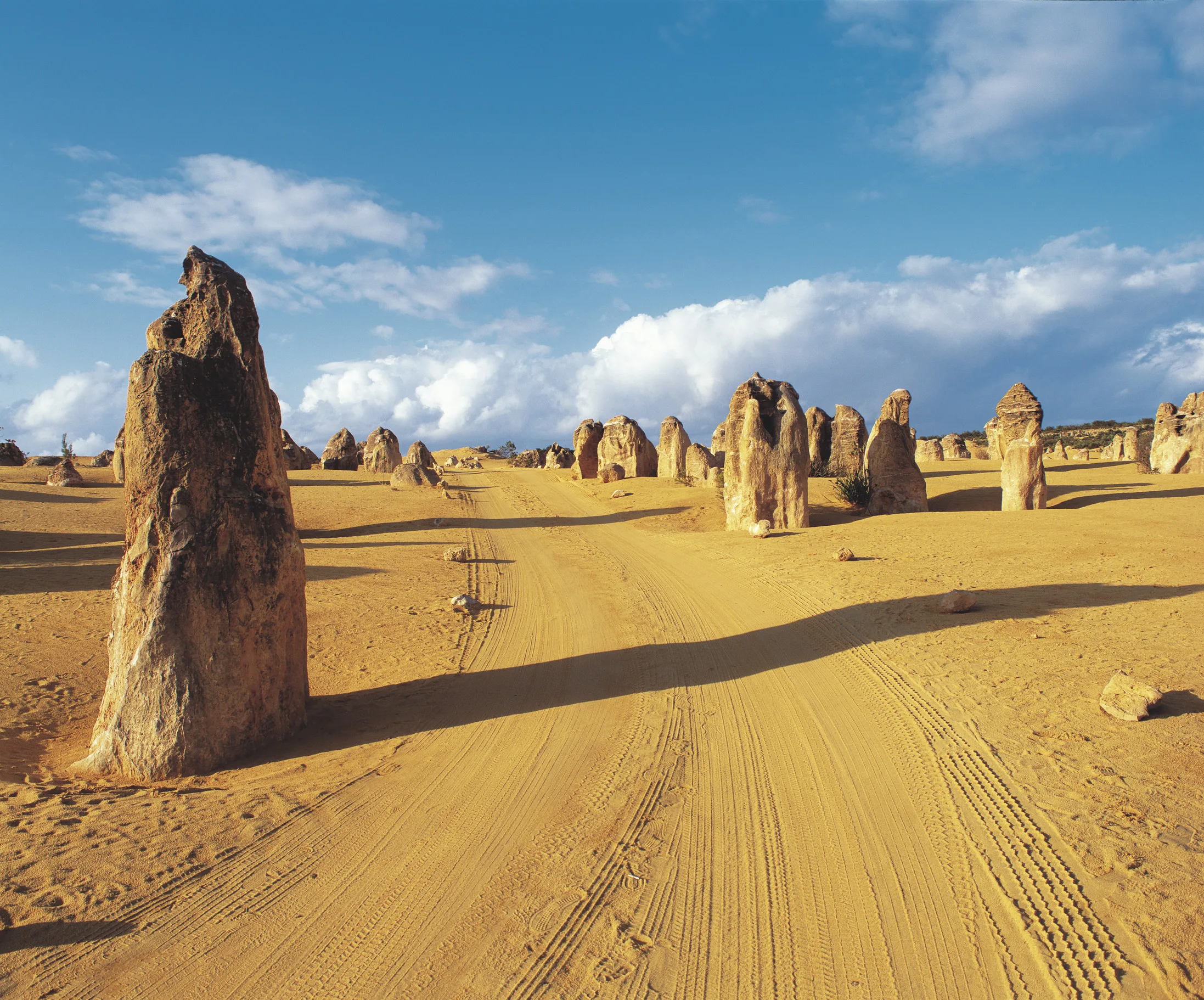 아래의 사진은 '피나클스 사막(Pinnacles Desert)'으로, 높이 수m의 수많은 석회석 기둥이 독특한 광경을 연출한다. 주변은 6000만 년 전 해변이었던 곳으로, 조개가 퇴적해 석회암질의 지층을 만들었다. 석회암질 지층 위에 나무가 자라 숲이 생겼지만, 서서히 건조화했다. 오랜 세월에 걸쳐 풍화가 진행되어 뿌리 사이에 있던 석회암층만이 기둥 모양으로 남았다고 생각된다.