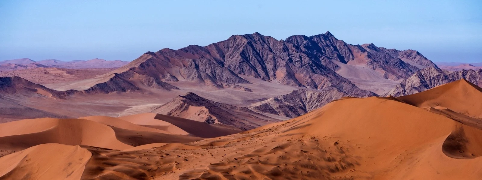 '나미브 사막(Namib Desert)'는 아프리카 대륙 대서양 쪽에 면한 '나미비아(Namibia)'의 서부에 있다. '나미브-나우클루프트 국립공원(Namib-Naukluft National Park)'으로서 보존되고 있으며, 북쪽은 앙골라에서 남쪽으로는 남아프리카공화국까지, 남북 1288km에 걸쳐 펼쳐져 있다. 전체 넓이는 약 5만 km2에 이른다. '나미브 사막'은 약 800만 년 전에 생긴 세계에서 가장 오래된 사막이라고 생각된다. '석영'으로 이루어진 하얀 모래 표면은 암석 광물에서 녹아 나온 철분으로 코팅되어 있다. 그것이 바닷바람과 안개에 의해 오랜 시간에 걸쳐 산화해 산화철이 되고 붉은 모래로 바뀐다.