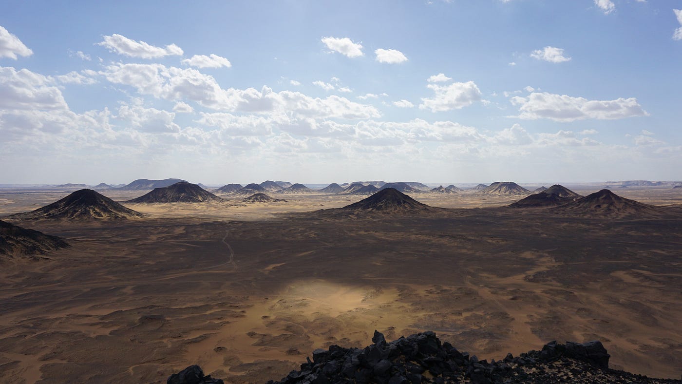 - 사진B(검은 사막): 사하라 사막 북동쪽에 있는 이집트에 30km에 걸쳐 펼쳐진 검은 사막이다. 작은 검은 산이 흩어져 있다. 1억 8000만 년 전 쥐라기에 분화했다고 생각되는 화산에서 분출한 조립 '현무암(Dolerite)'이 오랜 세월에 걸쳐 풍화하며 부서져 검은 모래가 만들어졌다.