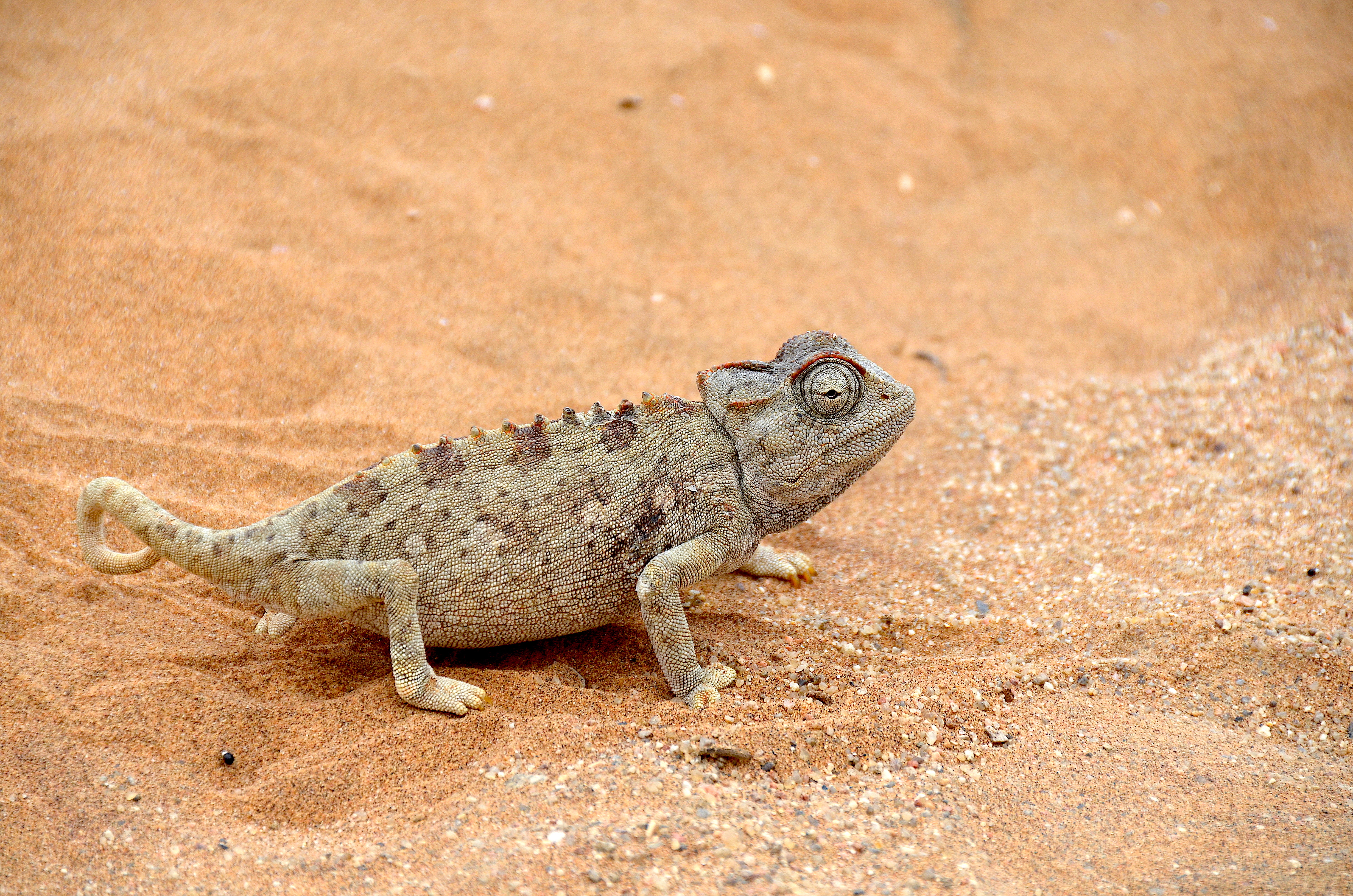 '나마쿠아카멜레온'은 기온에 따라 체색을 바꿔 체온을 조절한다. 추울 때는 열을 흡수하기 쉽도록 거무스름한 색으로, 더울 때는 열을 반사하기 쉽도록 흰색으로 바꾼다. 길이 20~25cm로, '남아프리카'와 '나미브 사막(Namib Desert)'과 '바위가 많은 곳'에 서식한다. 주로 대형 곤충을 잡아먹지만, 때로는 도마뱀과 뱀도 잡아먹는다.