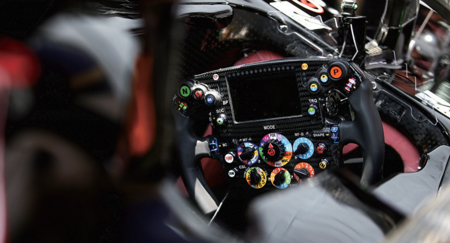 아래의 사진 C는 레이스 카를 달리게 하는 중추 신경인 '스티어링 휠(Steering Wheel, 핸들)'이다. F1 레이스 카의 스티어링 휠'은 1회전 이상 돌릴 필요가 없기 때문에, 시판되는 자동차처럼 원형이 아니다. 전면에는 다수의 스위치와 버튼, 엔진 등의 상태를 나타내는 디스플레이가 배치되어 있다. 시판 자동차에는 주로 운전석 앞쪽의 패널 부근에 조작 스위치 등을 배치하지만, 좁은 '조종석(Cockpit)' 안에서 조작하는 F에서는 많은 스위치가 '스티어링 휠'에 배치되어 있다. '브레이크 작용'과 '연료의 조정', '무선 통신에 사용하는 라디오', '리어윙의 플랩으로 공기 저항을 조절하는 DRS', '음료수를 마시기 위한 스위치' 등 다양하다. 레이스 카를 달리게 하는 일 외에도 중추 신경과 같은 역할을 한다.