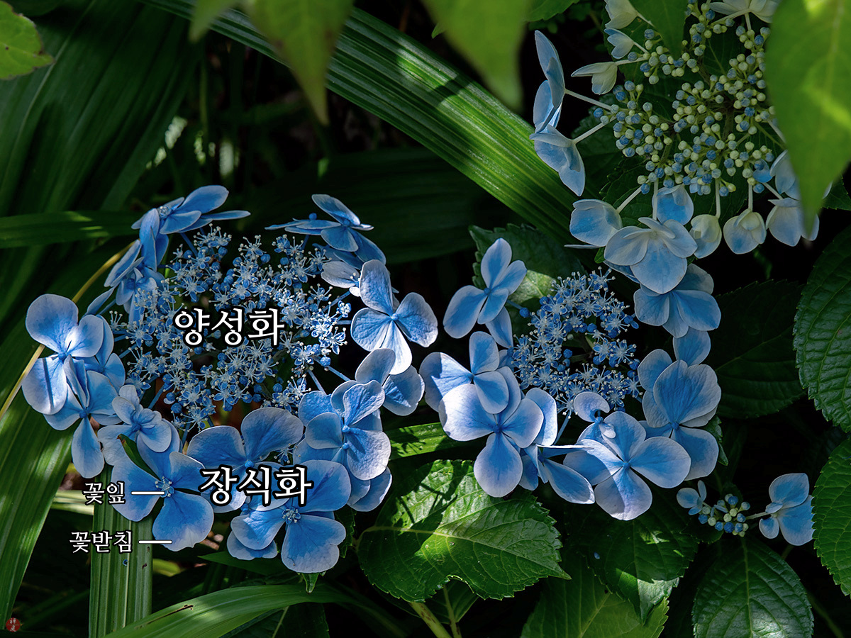 아래의 사진의 수국에서 꽃의 구조를 살펴보자. 수국에는 '장식화(裝飾花)'와 '양성화(兩性花)'가 있다. '꽃차례(花序, 꽃이 줄기나 가지에 붕어 있는 상태)'의 가장자리에 있는 '장식화'는 눈에 두드러져서 '화분(꽃가루)'을 운반하는 곤충을 끌어들인다. 장식화의 '꽃잎'으로 보이는 부분은 실은 '꽃받침(Calyx)'이며, 꽃잎 아래에 있다. '장식화'의 중앙에 암술이나 수술도 있지만, 정상으로 발달하지 않기 때문에 장식화의 대부분은 '종자(Seed)'를 만들 수 있다.