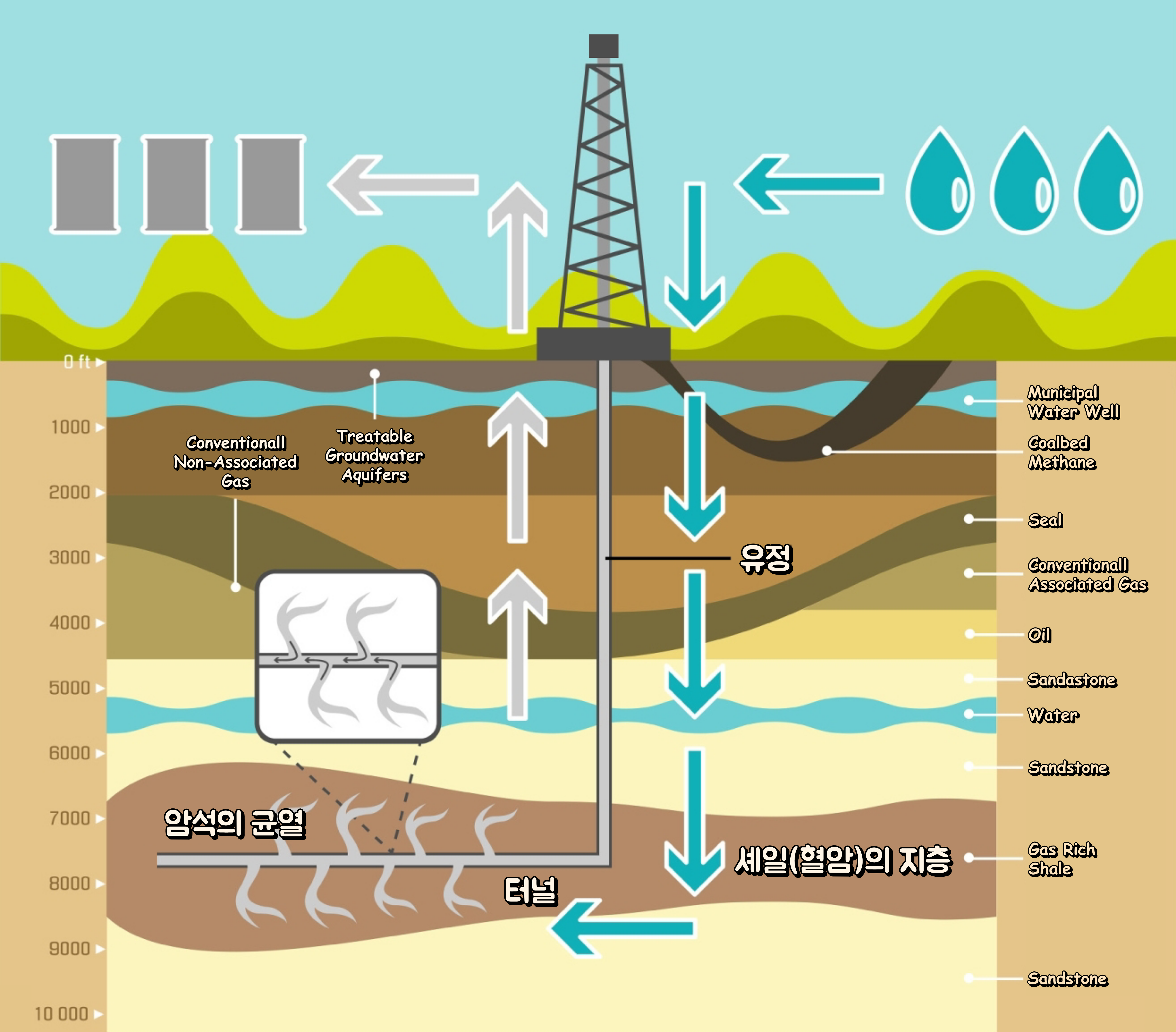 '셰일 가스(Shale Gas)'는 지하 수천 m의 '셰일층(혈암층)'에 있는 천연가스이다. 다른 재래형 천연가스와 마찬가지로, 지하 깊은 곳에서 유기물이 열의 작용이나 박테리아에 의해 분해됨으로써 만들어진다. 셰일 가스는 암석 안에 갇혀 있어, '유정(油井: 석유의 원유를 퍼내는 샘)'을 파는 것만으로는 꺼낼 수 없다. 그래서 기존에는 그 존재을 알고 있었음에도 불구하고, 거의 이용되지 않는 자원이었다. 그러나 유정의 바닥에서 옆으로 터널을 파는 기술이 생기면서, 상황이 급변했다. 셰일층에 뻗어있는 터널에 고압(최대 1000기압)의 물을 집어넣으면, 암석에 가는 균열이 많이 생긴다. 서서히 압력을 낮추면 갇혀 있던 셰일 가스가 암석에서 해방되어, 터널로부터 유정을 지나 지상으로 물과 함께 가스가 위로 분출한다.