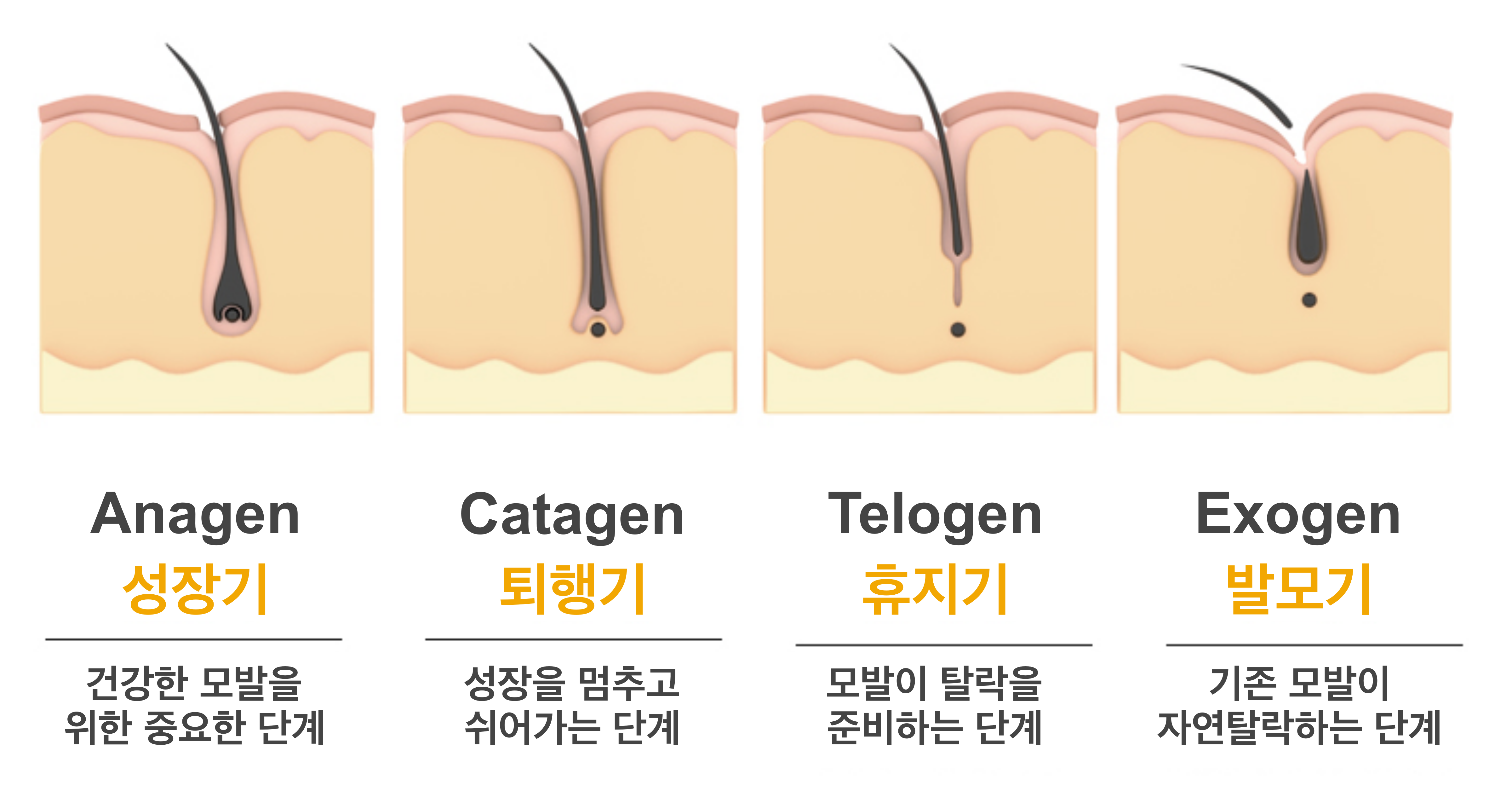 머리카락의 수명은 보통 3~6년이고, 자라나고 빠지기까지의 주기가 있다. 머리카락은 활발하게 자라는 '성장기(Anagen)', 자라는 것이 멈추는 '퇴행기(Catagen)', 머리털이 탈락을 준비하는 '휴지기(Telogen)', 기존 모발이 자연 탈락하는 '모발기(Exogen)'를 를 주기적으로 되풀이한다. '성장기'에는 '모모기(머리카락과 모낭의 세포가 생기는 곳)'에서 세포가 활발이 분열되어 머리카락이 자라나지만, '퇴행기'에는 모모기가 퇴화해 세포 분열과 머리카락의 성장이 멈춘다. 이후 '휴지기' 때 머리카락이 피부의 표면으로 올라가다가 이윽고 빠지게 된다. '모모기'에서 활발하게 세포 분열이 되풀이되어 새로운 머리카락이 자란다.