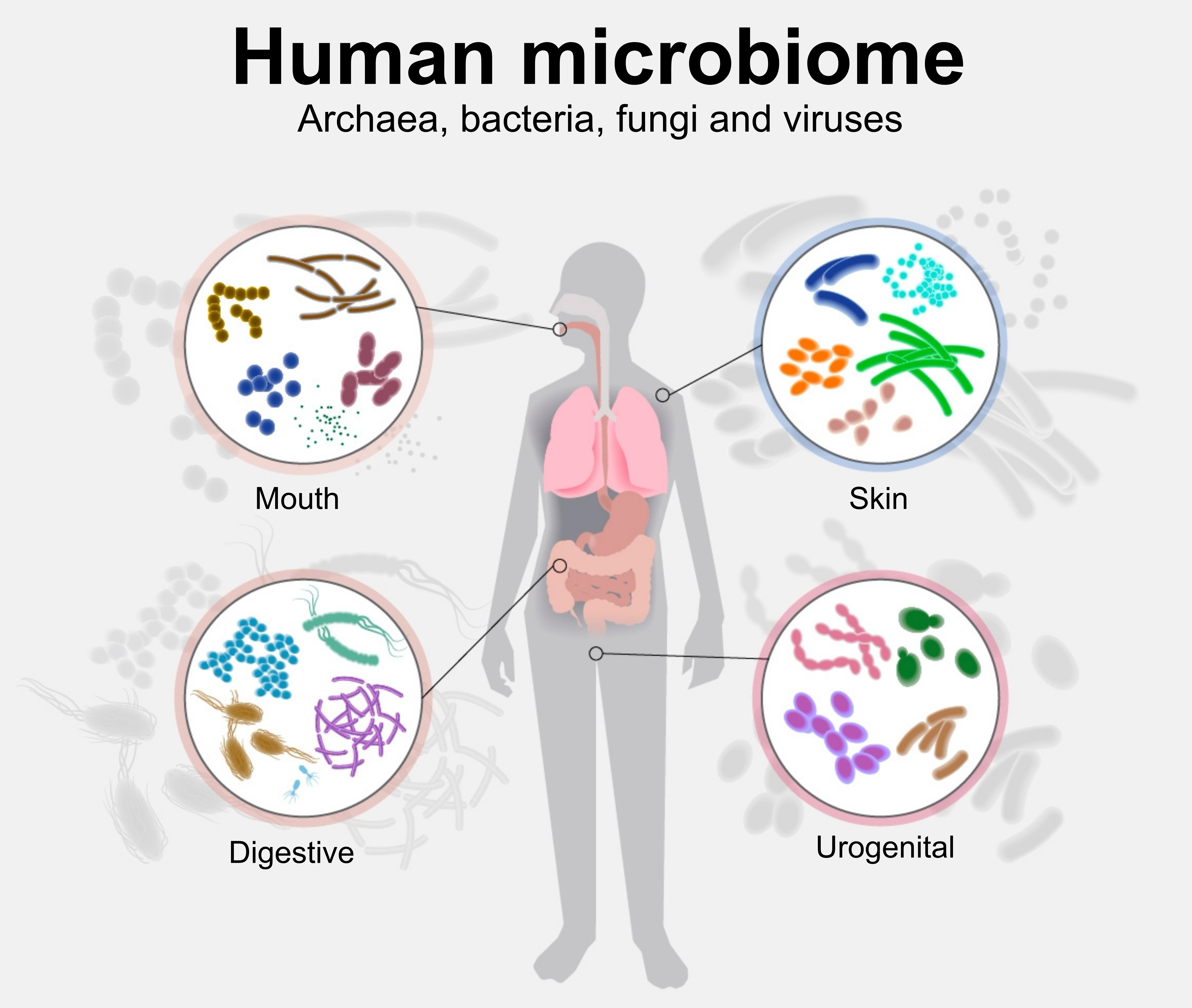 우리의 몸에는 '비피두스균'이나 '여드름균' 등 다양한 '세균(Bacteria)'이 살고 있는데, 기본적으로는 해롭지 않고 생물의 몸에 항상 존재한다. 이처럼 생물의 입, 코, 피부, 장 생식기 등에 붙어사는 세균 등의 미생물을 '상재균(Resident Flora)'이라고 한다. 그리고 상재균 전체와 그것들이 지닌 유전 정보 전체를 가리켜 '마이크로바이옴(Microbiome)'이라고 한다. 사람의 몸에는 항상 수백조 개, 수 kg의 상재균이 살고 있으며, 알려진 상재균의 주요 종류만 해도 200~300종이라고 한다. 상재균은 피부, 입, 소화관, 성기 등 몸속에서도 따뜻한 곳, 수분이나 영양분이 많은 곳에 많이 있다. 상재균이 가장 많은 곳은 대장이고, 그다음은 입이다. 반면 심장과 혈관계는 보통 무균 상태이고, 뇌와 척수에도 상재균이 존재하지 않는다. 세균이 서식하기 어려운 환경인 '위'에는 상재균의 수가 적지만, '헬리코박터 파일로리균'처럼 다른 곳에서는 볼 수 없는 특수한 세균을 볼 수 있다.