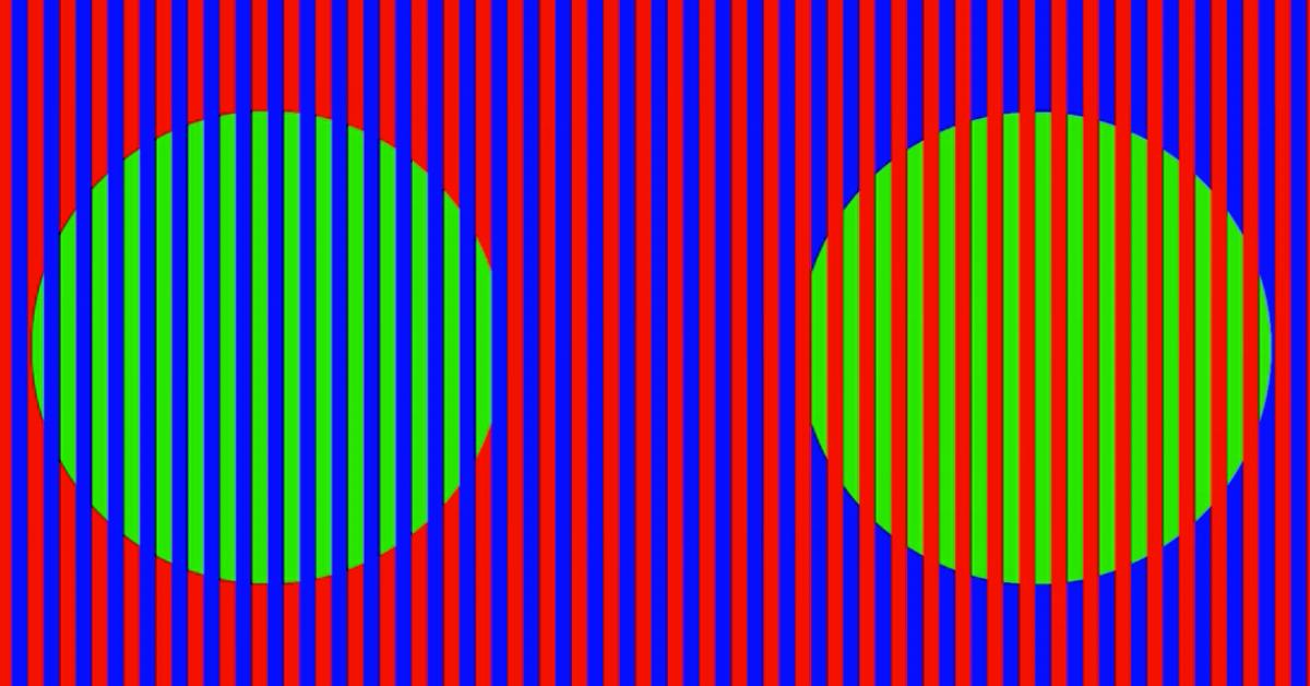 같은 색깔이지만 주위의 배색에 의해 색깔이 달라 보이는 경우도 있다. 아래의 그림에서 왼쪽 원은 진한 녹색으로 보이지만, 오른쪽 원은 연두색으로 보인다. 하지만 이 원 2개는 모두 같은 녹색이다. 이것도 색깔이 '심리적인 양'임을 나타낸다.