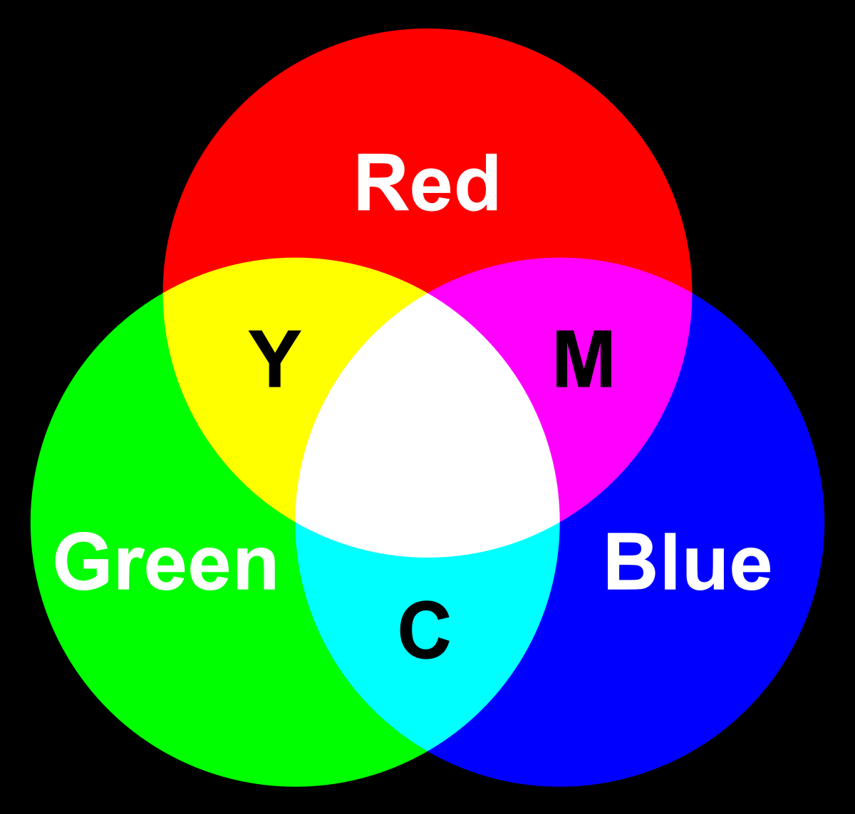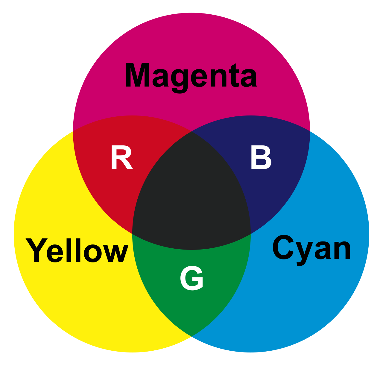 물체에 흡수, 반사된 후의 보이는 빛의 색은 원리적으로 '시안(Cyan)', '마젠타(Magenta)', '옐로(Yellow)'의 '색의 삼원색(CMY)'으로 모두 만들 수 있다. '색의 삼원색'을 아래와 같이 동그라미로 겹쳐 그리면 '감산 혼합(Subtractive Color Mixture)'된다. 여기서 2색이 겹치는 부분에 주목해보자. 그 색은 빨강(Red), 초록(Green), 파랑(Blue)이다. 이 3색을 '빛의 삼원색(RGB)'라고 한다.