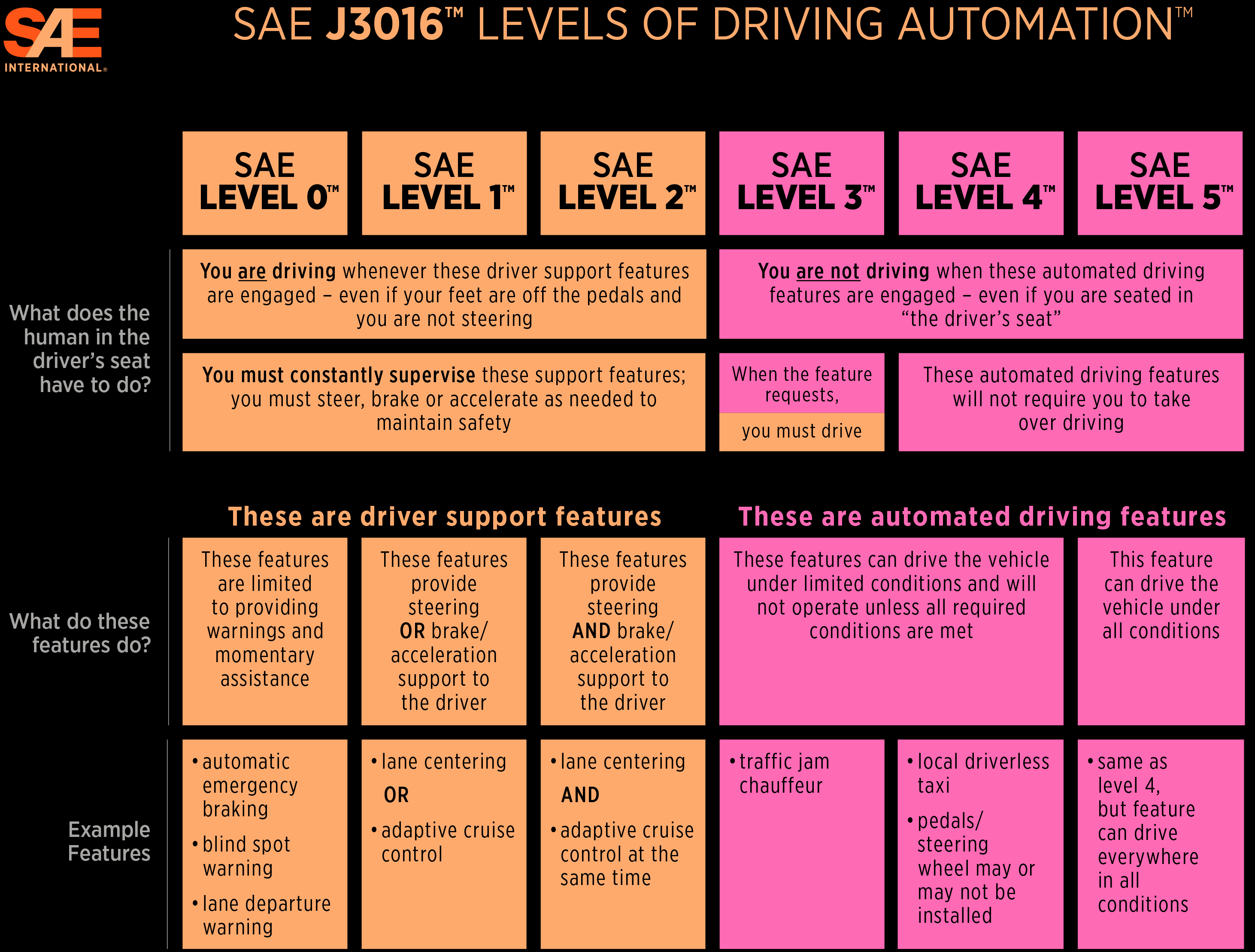 '자율 주행(Automatic Driving)'에는 국제적으로 널리 이용되는 자율 주행의 자동화 단계가 있다. 미국의 'SAE(Society of Automotive Engineers, 미국 자동차 기술자 협회)'라는 비영리 단체가 2016년에 규정한 자동 운전의 '레벨(level)' 구분이다. 0단계에서 5단계까지의 레벨이 있으며, 레벨이 높을수록 자동화의 정도가 높다.