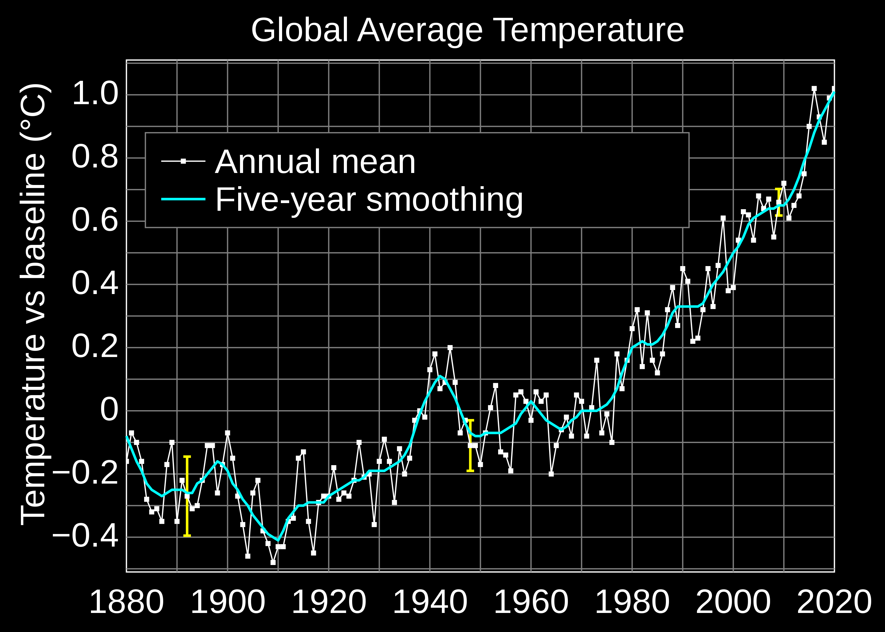 아래의 그래프는 1880년 이후의 연도별 세계 평균 기온을 나타낸 것이다. 검은색 선은 연간 평균 온도이고, 빨간색 선은 '5년 이동 평균선'이다. 파란색 바는 오차 범위를 나타낸다. 이 그래프를 보면, 1850년 이후의 연평균 기온 그래프를 보면, 오른쪽 위로 끊임 없이 온난화가 이어지고 있음을 알 수 있다. 그래프는 근년이 접어들수록 기울기가 더 가팔라져, 최근 25년의 변화만으로 보면 그 경향이 뚜렸하다. 게다가 그래프는 근년으로 접어들수록 기울기가 더 가팔라지고 있다. 20세기 이후, 온난화의 속도는 가속되고 있다.