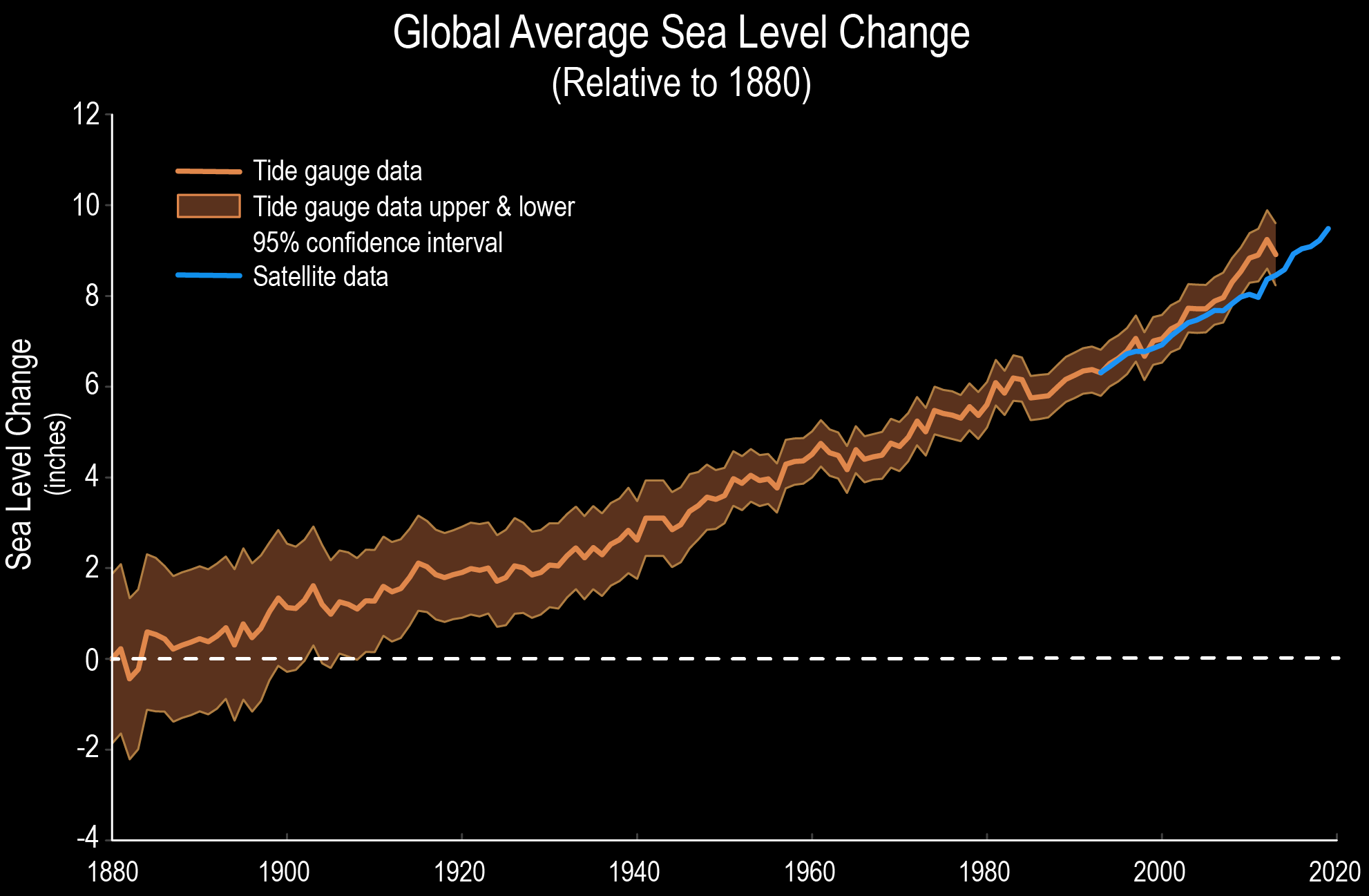 아래의 그래프는 지구 전역의 해수면의 높이를 평균해 그 변화를 나타낸 것이다. 파란색 선은 '조위계'에 의한 관측을 바탕으로 추정한, 지구 전역의 해수면 높이의 평균값이다. (파란색으로 칠해져 있는 면적은 오차의 범위를 나타냄) 주황색 선은 1993년 이후의 위성 관측값이다. 이 그래프에서는 1880년의 해수면의 평균값을 0으로 하고 있다.