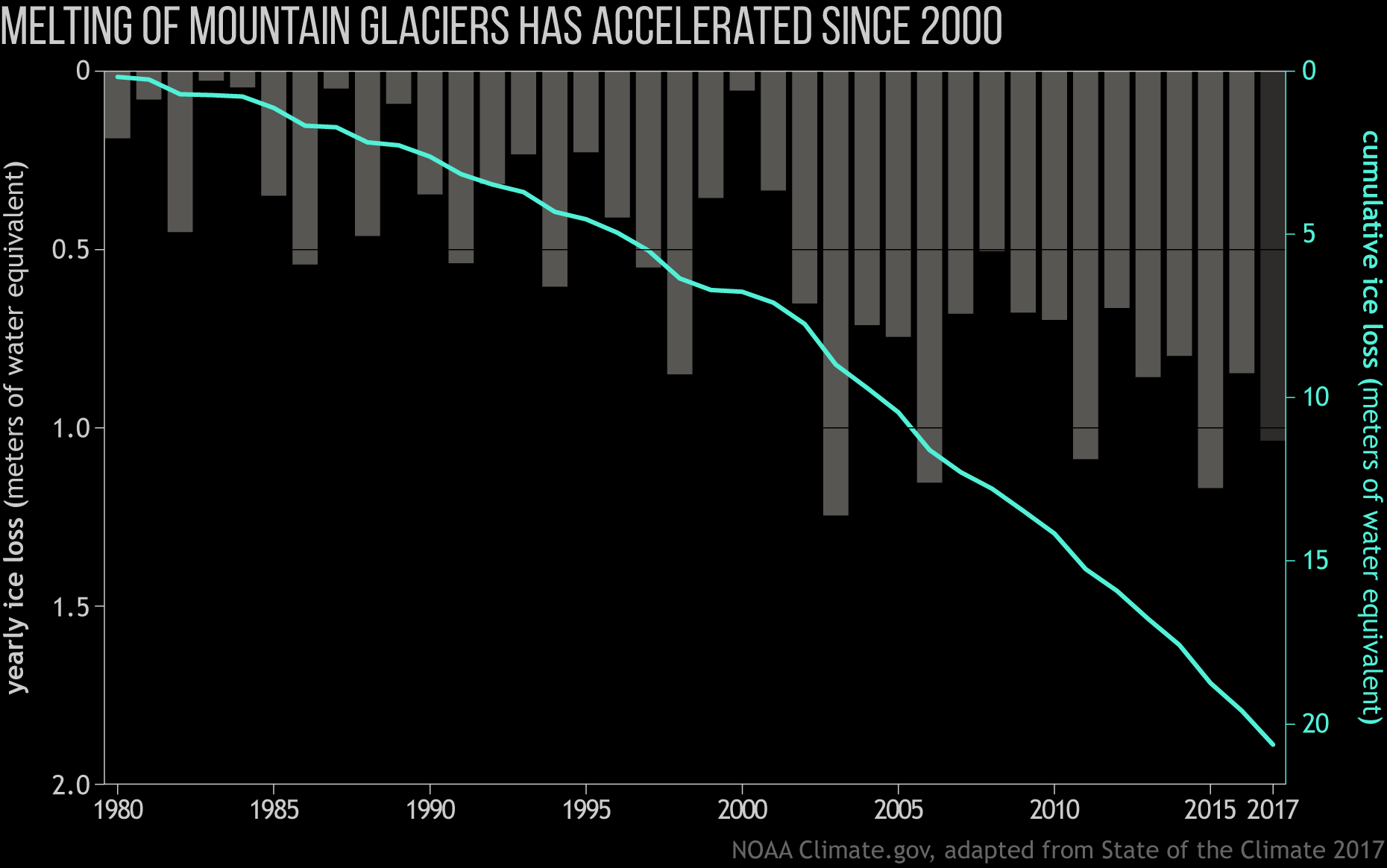아래의 그래프는 1980~2017년 사이에 세계의 빙하의 무게가 얼마나 변했는가를 보여주는 그래프이다. 막대 그래프는 전년부터 빙하의 무게의 증감량을 나타내고, 붉은색 선은 해가 지남에 따라 증감량을 합해나간 수치를 나타내는 것이다. 2000년 전후를 기점으로 산악 빙하가 감소하는 속도가 점점 가속화되고 있다는 사실을 알 수 있다.