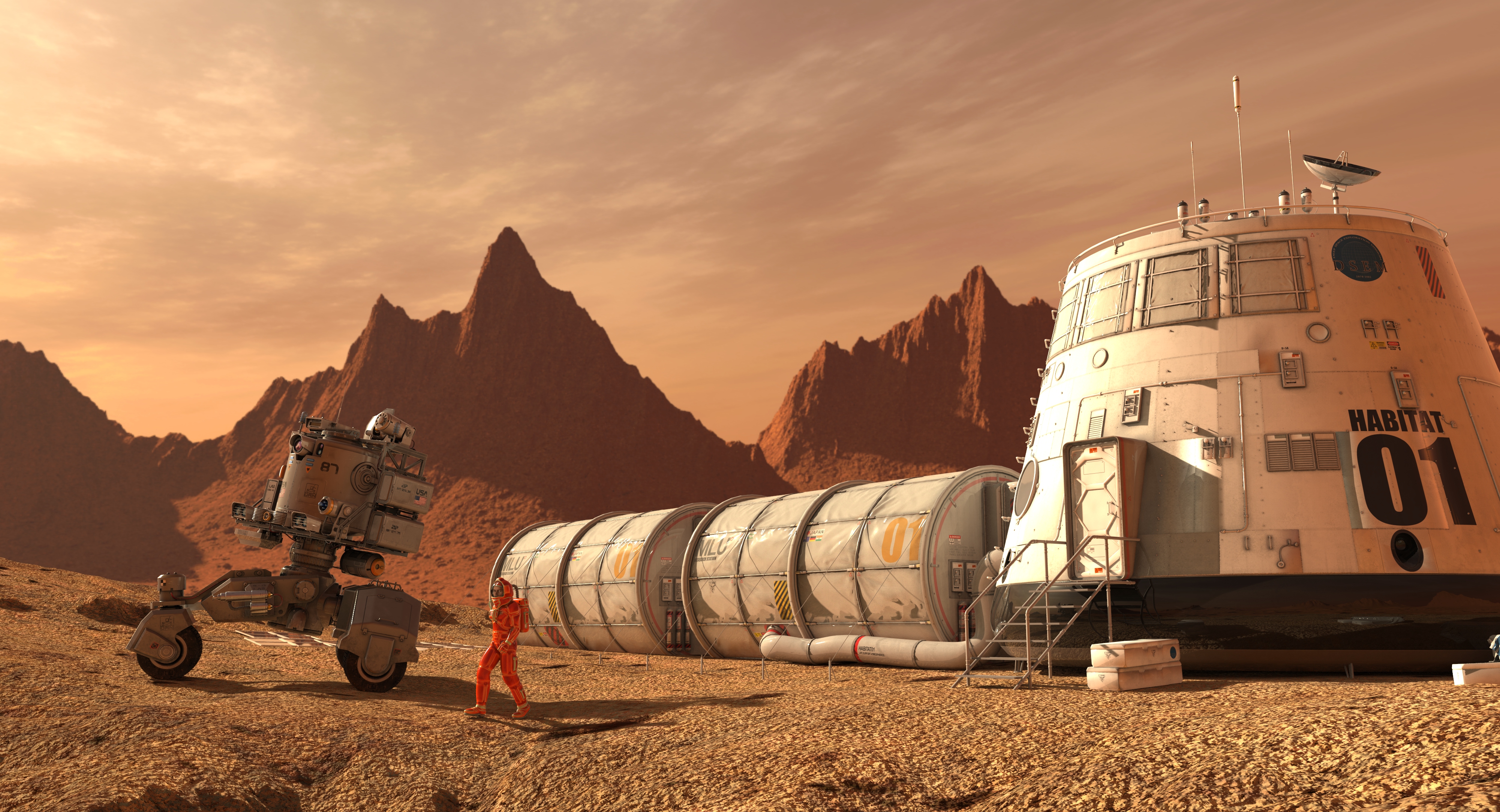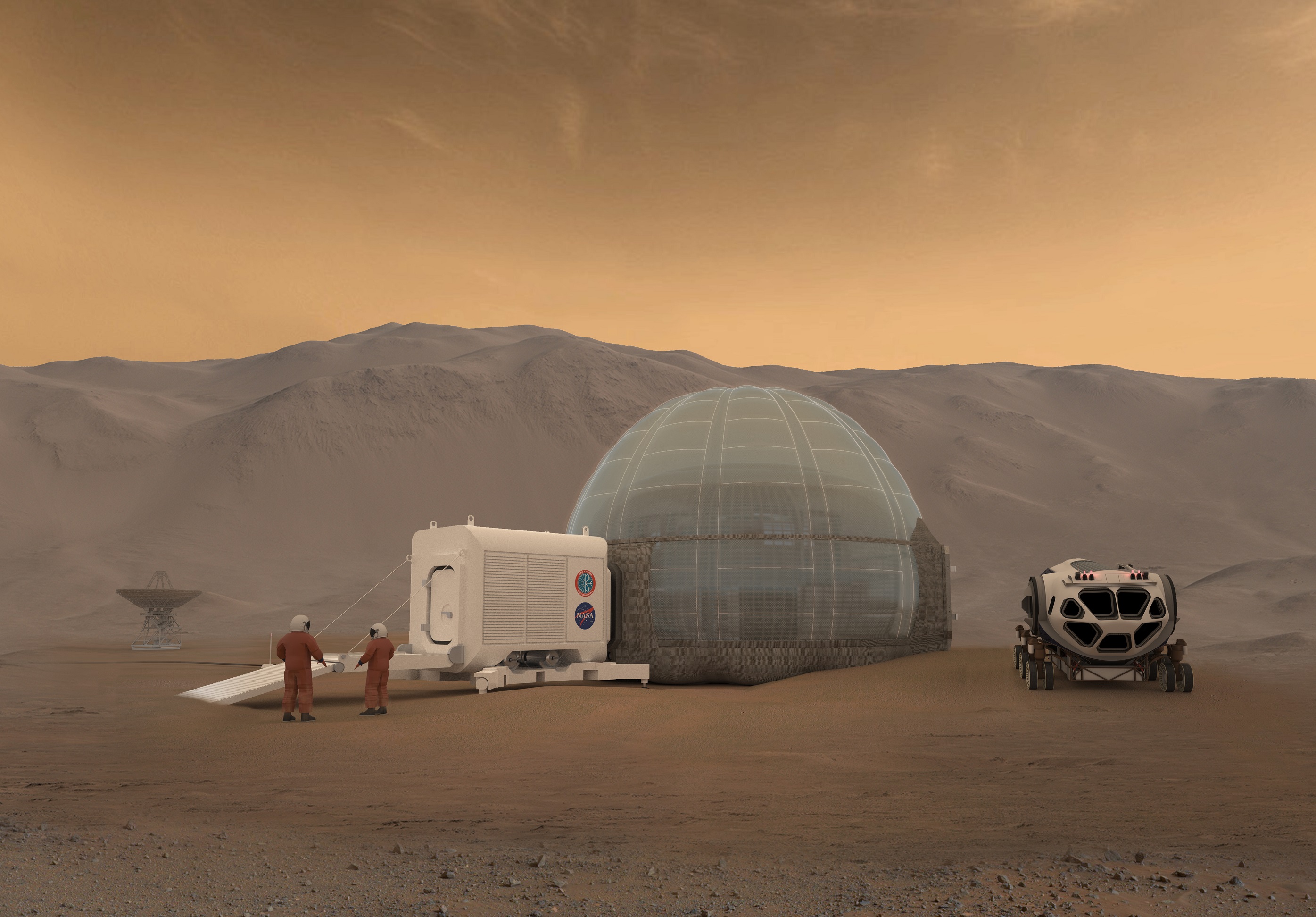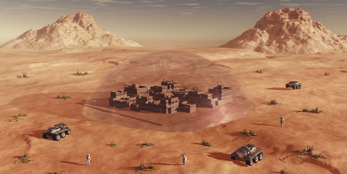 건물을 만들기 위한 재료는 화성에 있는 산화철에서 철과 강철을 추출하여 얻을 수 있다. NASA가 밝혀낸 바에 따르면 화성의 토양은 대체로 벽돌을 만들기에 적합한 것으로 밝혀졌다. 또한 화성의 대기압은 지구의 0.6%밖에 되지 않고 화성의 흙과 먼지에는 '과염소산염(금속 원소에 과염소산기가 결합된 염)'이 가득하다. '과염소산염'은 갑상선암 등 각종 암을 유발하는 독성물질이다. 때문에 실내 공간은 '에어락(Air Lock)'을 통해 완벽하게 밀폐된 공기 주입식 공간이 되어야 할 것이다. 이러한 밀폐된 공간에서 생활하는 것은 커다란 정신적 고통을 가져올 수도 있다.