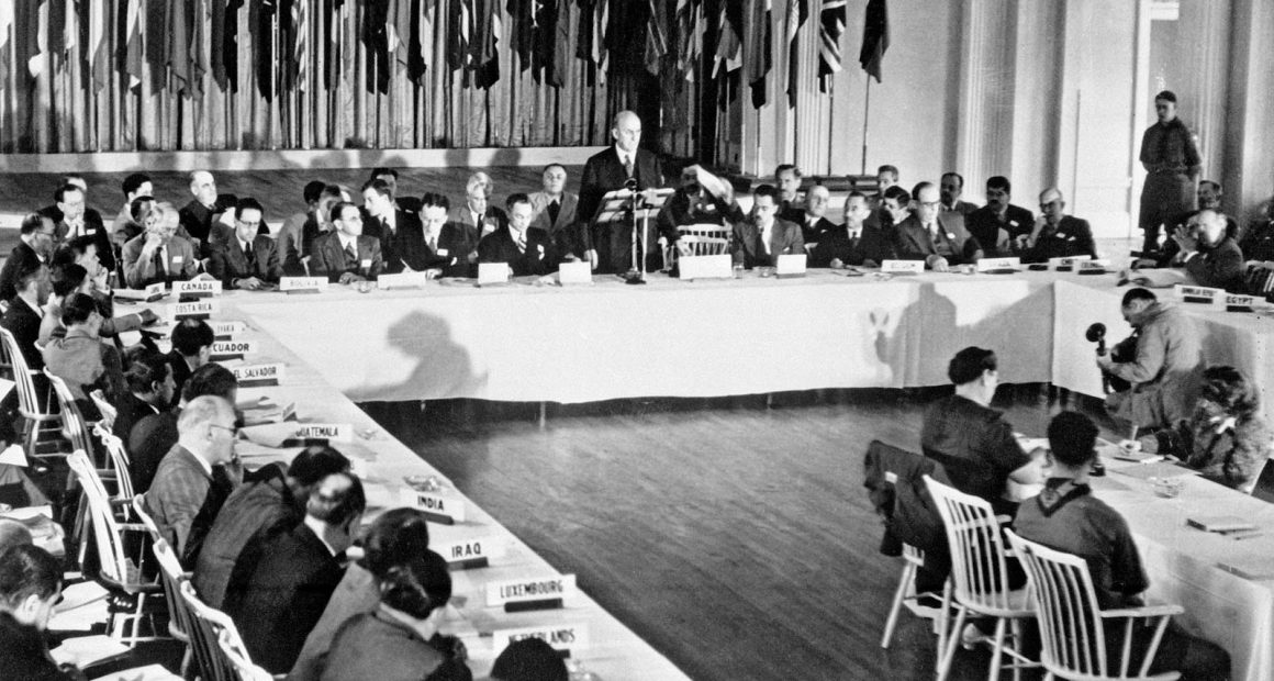 세계 2차 대전 말에 이르러서는 미국이 세계 중앙은행의 금 3분의 2를 소유하게 되었고 유럽에는 금이 하나도 없는 상태였다. 세계 화폐 제도가 붕괴할 수 있는 상황에 이른 것이다. 유럽에는 금이 없었지만 미국이 유럽에 달러를 대출해 줬기 때문에 유럽에 달러는 많았다. 이런 상황을 해결하기 위해 당시 뉴햄프셔 주의 브레턴우즈에 미국을 중심으로 44개의 연합국 대표가 모였다. 그리고 그들은 금융시장을 안정화시키고 무역을 활성화시키겠다는 명목으로 다른나라의 통화가치는 달러 대비 일정 비율로 결정되고 금 1온스를 35달러에 고정시키는 '브레턴우즈 협정(Bretton Woods Agreements)'을 맺게 된다. 이 협정으로 인해 미국의 달러는 기축 통화가 되었고 수년간 환율은 고정되었으며 모든 화폐에 신용을 불어 넣어줄 수 있었다.