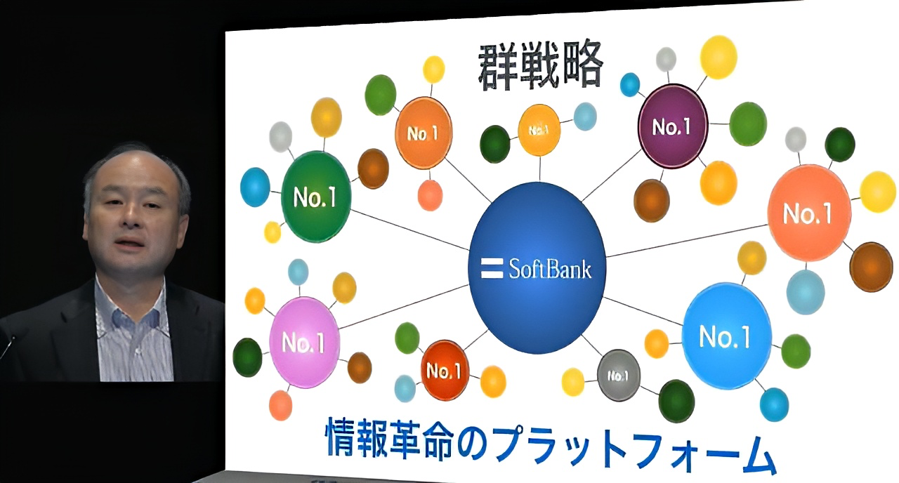 '군전략(Group strategy)'이란 시대의 패러다임을 미리 예측하고 만남과 이별을 반복하면서 유망 산업별로 최고의 기업을 보유하는 궁극의 경영 전략이다. 이렇게 모은 5000개의 기업들 사이에서 유기적인 관계를 만들고, 소프트뱅크의 조정으로 사업을 재편하기도 한다. 이것이 300년 후를 바라보는 손정의 회장이 목표로 삼고 있는 것이다. 다만 50% 이상의 주식을 취득해 자회사로 삼기보다는 20~40% 정도만 취득해 경영권을 보장해 주어 기존의 경영 방식을 존중해 주는 방식을 추구한다. 확실한 비전을 가지고 있는 똑똑한 경영진들은 경영권을 뺏기는 것에 대한 강한 거부감을 가지고 있기 때문이다.
