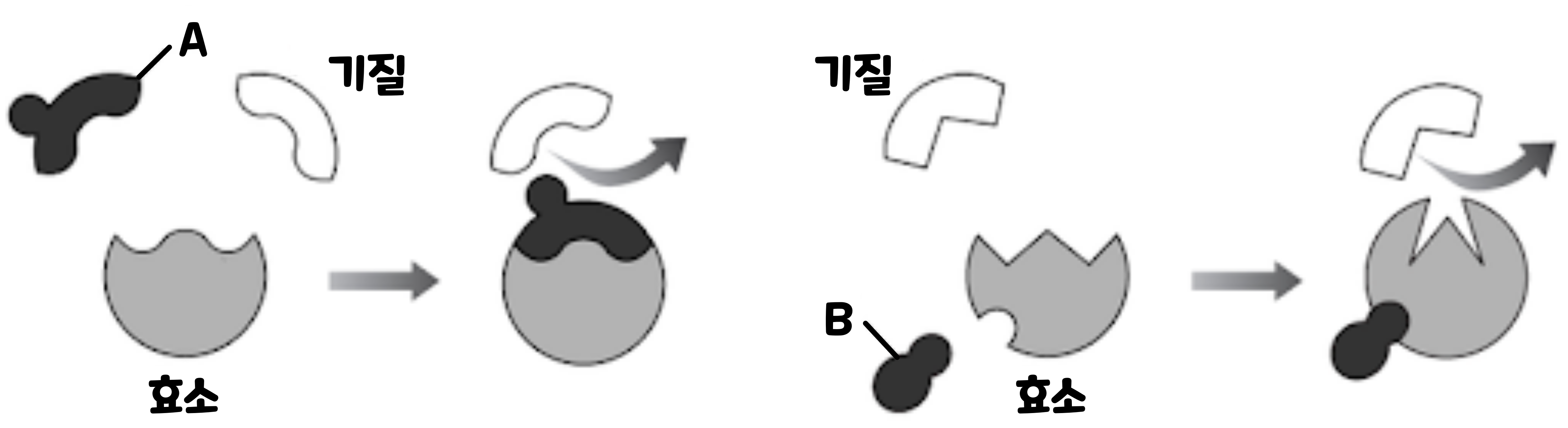 효소와 결합하여 '효소-기질 복합체'의 형성을 방해하는 물질을 '저해제(Inhibitor)'라고 부른다. 저해제는 '경쟁적 저해제(A)'와 '비경쟁적 저해제(B)'로 나눌 수 있다. '경쟁적 저해제'는 저해제의 구조가 기질과 유사하여 효소의 활성부위와 결합하여, 효소를 기질과 결합하지 못하도록 방해한다. 반면 '비경쟁적 저해제'는 효소의 활성 부위가 아닌 다른 부위에 결합하여, 활성부위를 변형시켜 기질과 결합하지 못하도록 방해한다.