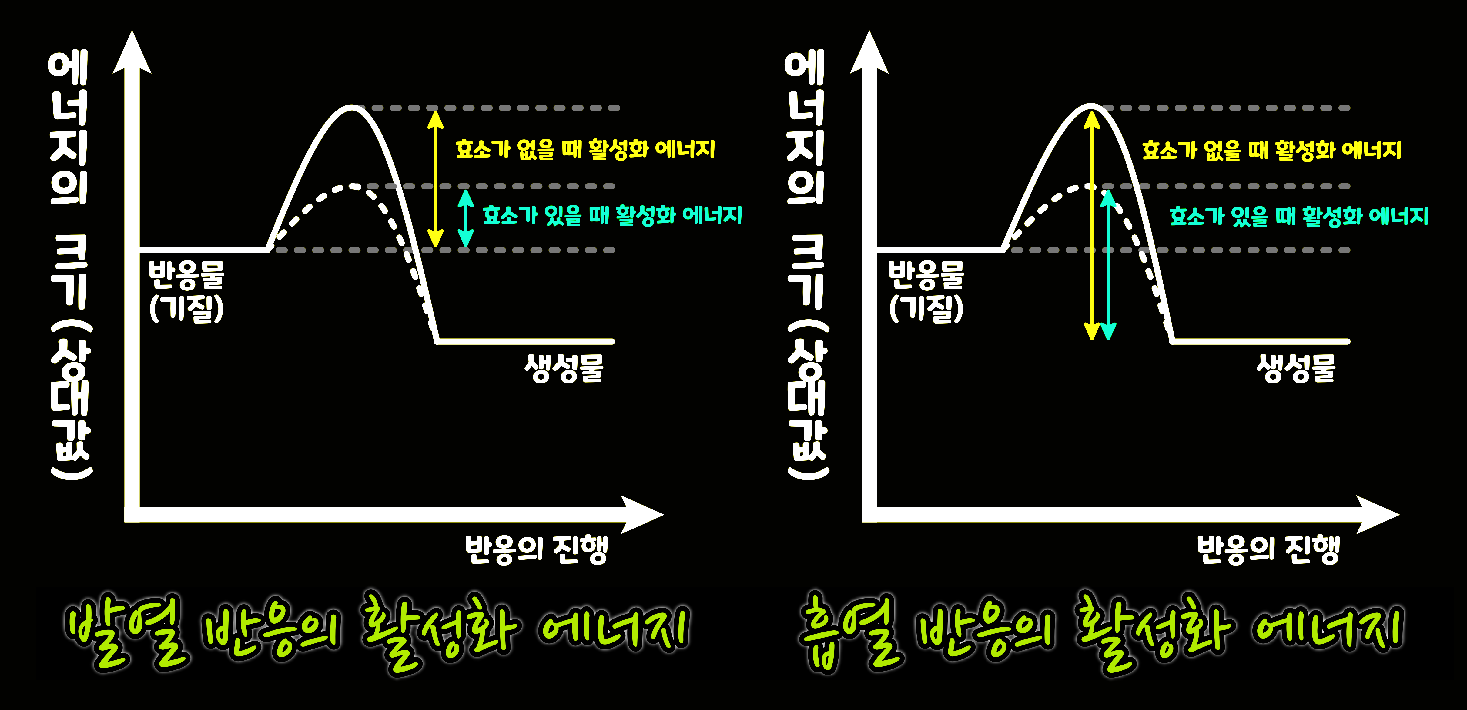 '활성화 에너지(Activation Energy)'란 어떤 물질이 화학 반응 일으키기 위해 필요한 에너지이다. 화학 반응이 일어나기 위해서는 반응물이 활성화 에너지 이상의 에너지를 가지고 있어야 한다. 반응의 속도를 올리고 반응을 일으킬 수 있는 분자 수를 낮추는 방법은 바로 활성화 에너지를 낮추는 것이다. 그리고 활성화에너지를 낮추는 역할을 하는 것이 바로 효소이다. '효소'는 반응물인 기질과 결합하여 물질대사를 빠르게 일어나게 하는 촉매 역할을 한다.