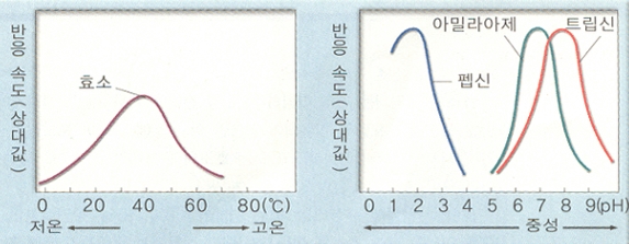 효소마다 활성이 최대가 되는 최적 온도와 최적 pH가 존재한다. 효소가 관여하는 화학 반응에서는 최적온도까지는 효소와 기질이 더 빈번하게 충돌하여 반응이 빨라지지만 최적 온도를 넘어서면 효소의 활성 부위가 변성되어 반응 속도가 급격히 느려진다. 한번 변성된 효소는 온도를 낮추어도 기능을 하지 못한다. 마찬가지로 최적 pH를 벗어나면 반응 속도가 느려지고 일정 범위를 넘어서면 효소 활성 부위가 변성되어 반응 속도가 급격히 느려진다.
