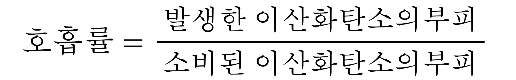 '호흡률(Respiratory Quotient)'이란 호흡 기질이 세포 호흡을 통해 분해될 때, 소비된 산소의 부피에 대한 발생한 이산화탄소의 부피비를 말한다. 식으로 표현하면 아래와 같다. 호흡률은 탄수화물이 1, 지방이 약 0.7, 단백질이 약 0.8 정도 된다. 호흡 기질에 따라 호흡률이 다른 이유는 '탄소(C)', '수소(H)', '산소(O)'의 원자 구성비가 다르기 때문이다.