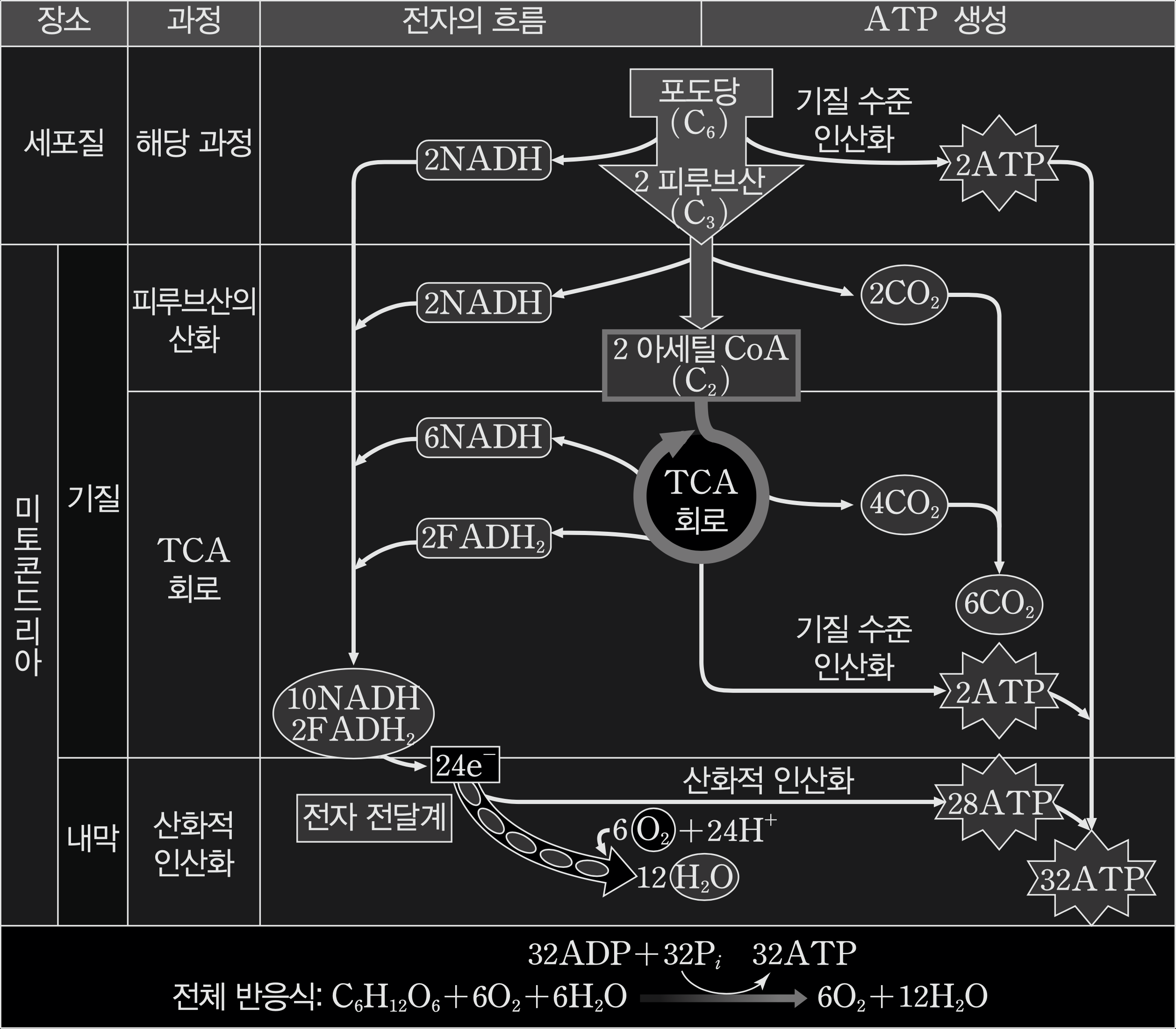 위에서 설명한 세포 호흡의 전 과정을 그림 하나로 정리하면 다음과 같다.