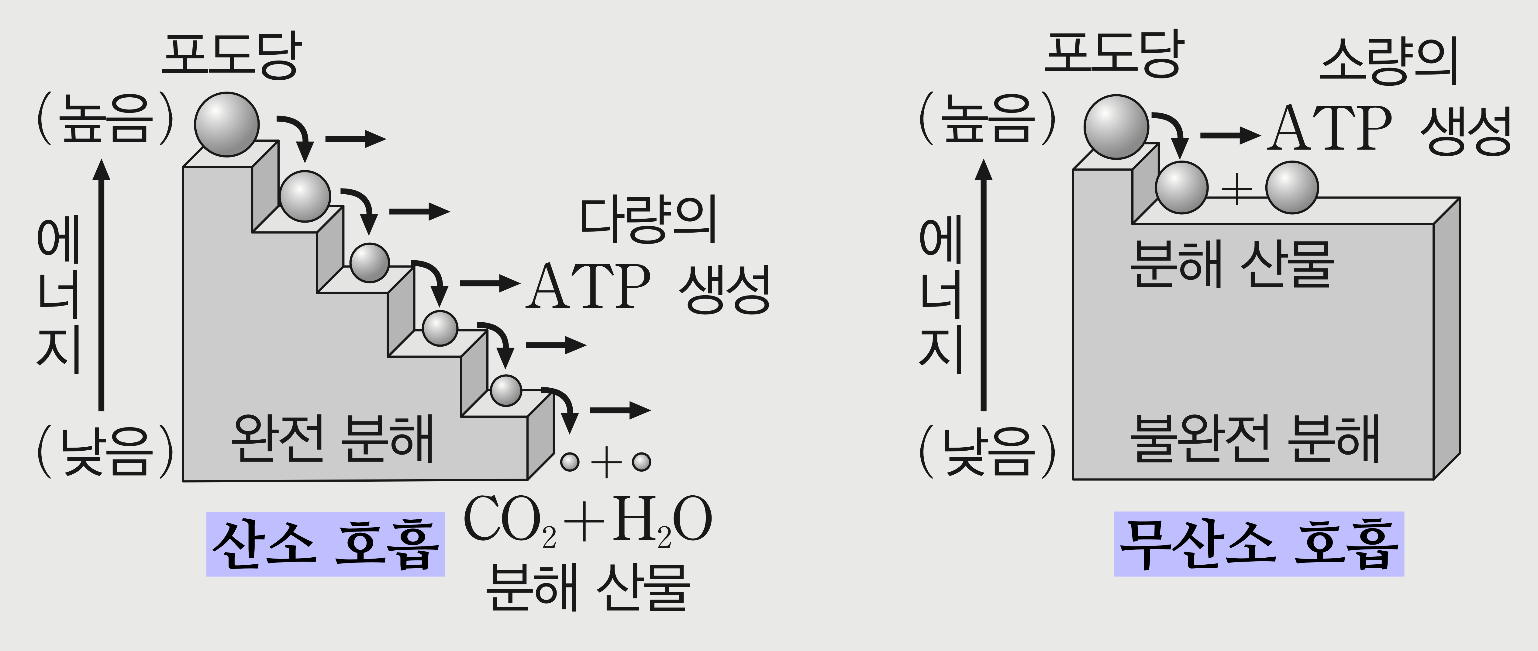 C6H12O6(포도당) + 6O2+ 6H2O ➡️ 6CO2 + 12H2O + 에너지 (최대 32ATP + 열에너지)