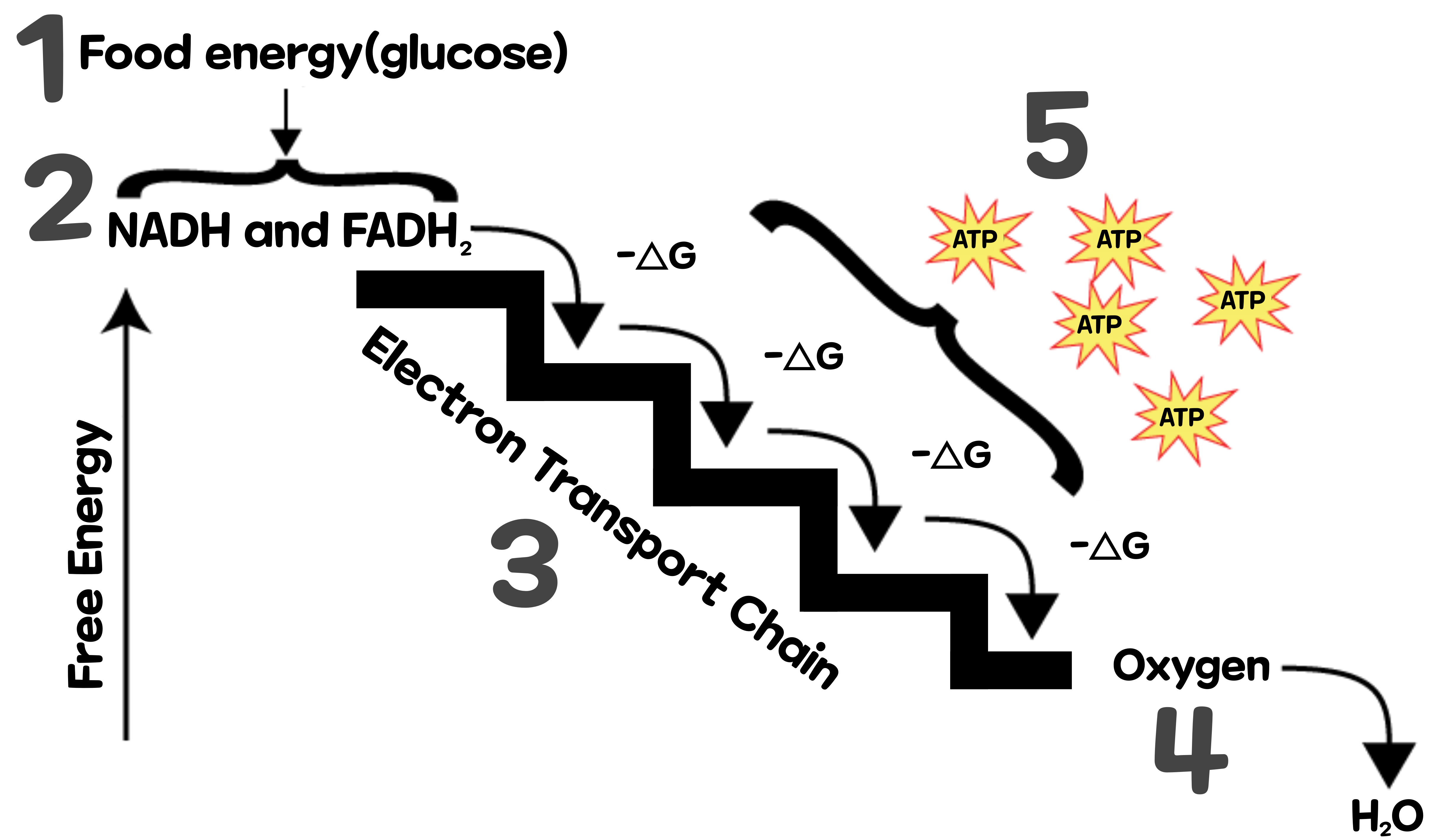 너무 복잡하니까 잠깐 정리해 보고 넘어가자. '해당과정(Glycolysis)'과 '피루브산의 산화(Pyruvate Oxidation)', 'TCA 회로(TCA Cycle)'까지 지금까지 설명했던 과정을 거치면, 1분자의 포도당은 '탈탄산 효소의 작용'으로 6CO2, '탈수소 효소의 작용'으로 10NADH, 2FADH2, '기질 수준의 인산화'로 4ATP가 형성된다.