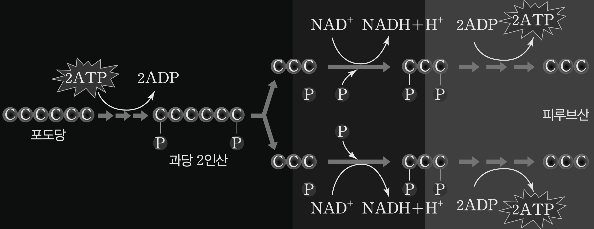 해당과정은 'ATP 소모 단계'와 'ATP 생성 단계'로 나눌 수 있다. 'ATP 소모 단계'에서는 2ATP를 소모하여 '포도당(C6)'이 '과당 2인산(C6)'으로 전환된다. 'ATP 생성 단계'에서는 여러 단계를 거쳐 2분자의 피부르산으로 분해되는데 '기질 수준 인산화 과정'에 의해 4ATP가 형성되고 '탈수소 효소의 작용'으로 2NADH가 생성된다. 포도당(C6)은 피루브산(C3)으로 산화되고 NAD+는 NADH로 환원되는 것이다.