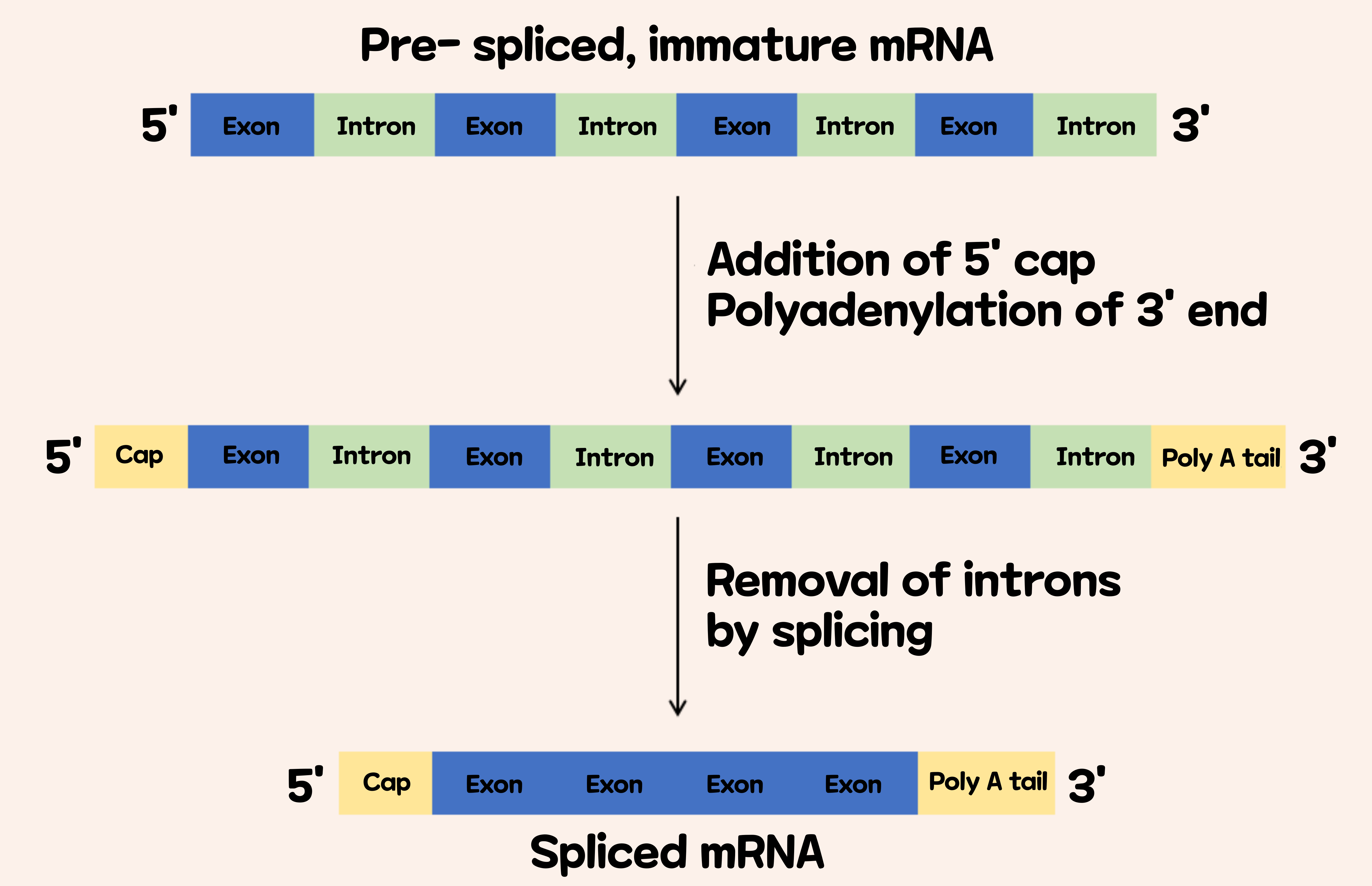 DNA가 RNA 형태로 복제되므로써 단백질로 번역되는 과정에서, 사실 복제된 RNA의 정보가 고스란히 단백질로 번역되는 것은 아니다. '전사(단일 가닥 DNA를 주형으로 RNA가 합성되는 과정)'된 유전자 영역의 대부분은 잘려나가는데, 이를 '스플라이싱(Splicing)'이라고 한다. 전사된 유전자 영역은 '인트론(intron)', '엑손(exon)'이라고 불리는 영역이 교대로 나열되어 있는데, 인트론은 처음에 전사된 RNA의 50~90%를 차지한다. 인트론이 제거된 다음 '엑손'이라고 불리는 영역은 연결되어 합쳐진다. 이후 엑손이 연결된 상태의 염기 배열인 'Spiced mRNA'는 핵 밖으로 나가 단백질 합성의 설계도로 이용된다. 그리고 '인트론'은 진핵생물에만 존재한다고 한다. 원핵생물은 전사된 RNA가 그대로 단백질로 번역된다.