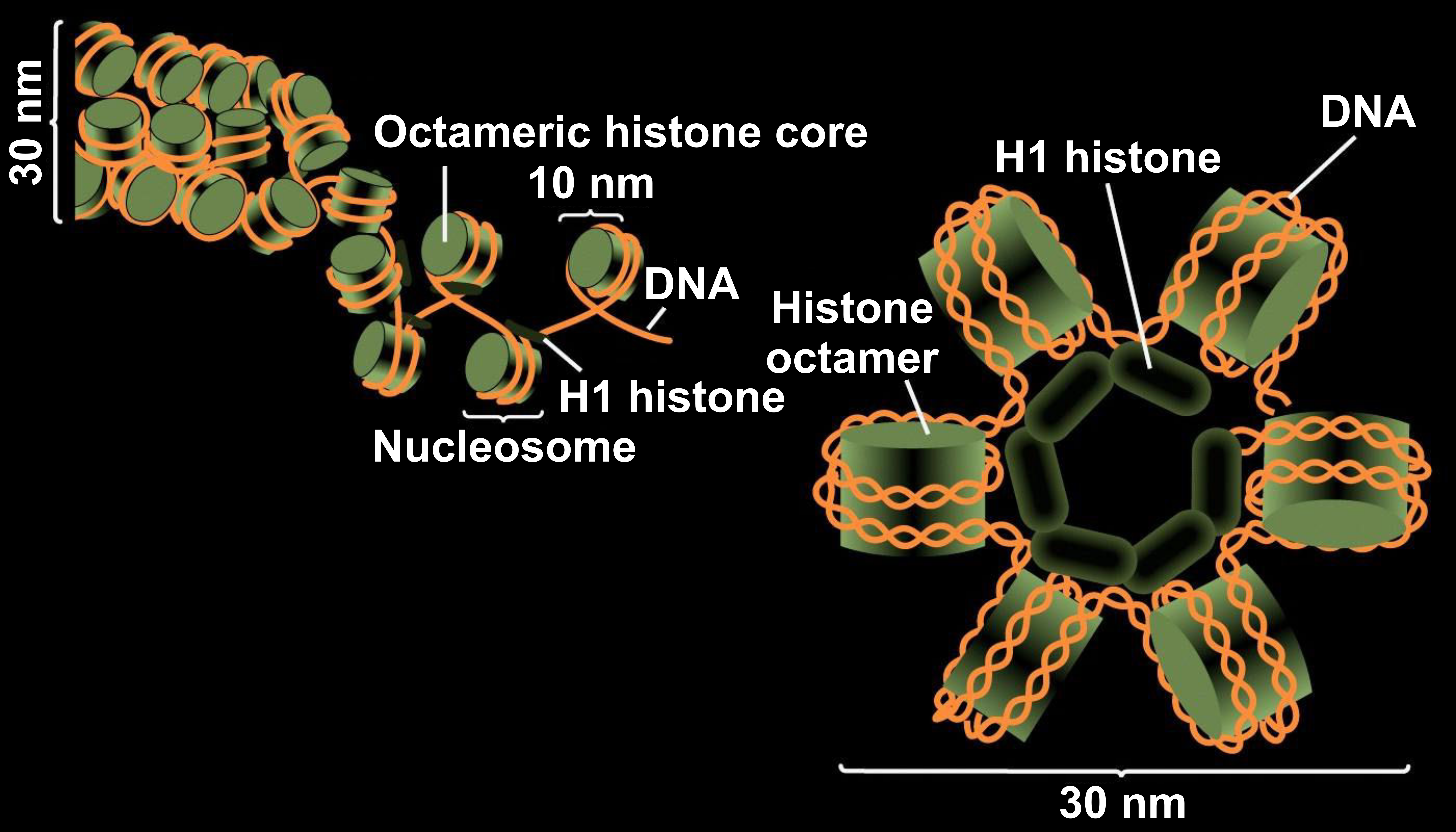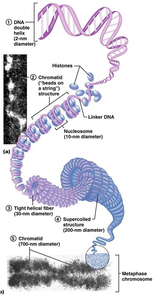 '염색체(Chromosome)'는 세포의 핵 속에서 가늘고 긴 '끈'처럼 되어 있는 DNA가 단단히 응축한 것으로, 세포 분열 때 확인할 수 있다. 사람 DNA의 경우 염색체 1개당 3cm 정도가 되고, 긴 것은 10cm에 이르는 것도 있다. 그러나 DNA가 들어 있는 세포핵의 크기는 약 5~8μm(마이크로미터) 정도 된다. DNA가 이 정도까지 빽빽하게 접혀 있을 수 있는 이유는 DNA가 '히스톤'이라는 단백질에 휘감겨 있기 때문이다. 정확히는 DNA가(147 염기 쌍마다) 8개의 히스톤이 모인 복합체의 주위를 원반 모양으로 휘감고 있으며, 이 구조를 '뉴클레오솜(Nucleosome)'이라고 한다. 히스톤 복합제 주위를 감은 DNA는 다음의 히스톤 복합체 주위를 다시 감고 이것을 계속 되풀이해 마치 목걸이 같은 구조가 된다. 이 구조를 '염색질(크로마틴(Chormation))'이라고 한다. 염색질은 더 응축되어 30nm 염색질 섬유'라는 구조를 취하고 이것이 더욱 응축되어 최종적으로 염색체의 구조로 마무리된다. 이때는 DNA가 뻗은 상태보다 10,000 배나 응축되어 있다. 하지만 항상 이렇게 빽뺵한 상태가 유지되는 것은 아니다. DNA가 복제되고, 단백질이 만들어질 때 등에는 응축 상태가 풀려야 한다. 예를 들어 세포 분열에 앞서 DNA의 복제가 일어나기 위해 DNA의 구조가 느슨해지는 것이다. 이후 세포 분열을 준비하기 위해 다시 빽빽하게 응축한다. 이렇게 DNA의 구조는 일정한 것이 아니라 상황에 따라 응축하거나 느슨해진다.