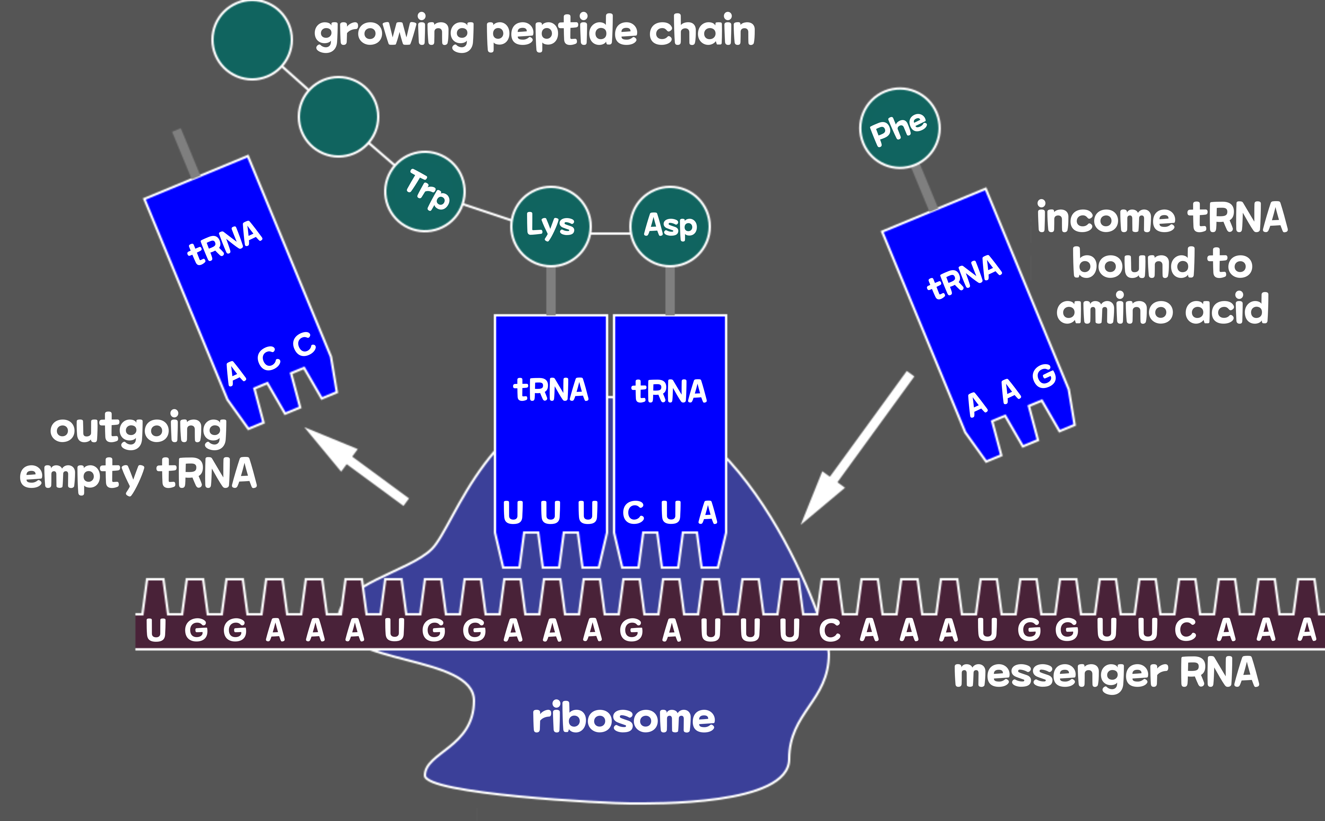 DNA는 먼저 'RNA(리보핵산)'의 형태로 복제된다. RNA의 기본단위도 DNA처럼 뉴클레오티드이며, DNA와 매우 비슷하다. RNA로 복제될 때의 방법도 DNA가 복제될 때와 똑같다. 다만, 당의 종류가 다르고, RNA 사슬에서는 'T(티민)' 대신에 'U(우라실)'이 사용된다. 이렇게 세포의 핵 속에서 복제된 RNA 사슬을 '메신저 RNA(mRNA)'라고 부른다. mRNA는 단백질을 만드는 공장인 '리보솜'으로 향한다. tRNA는 3개의 뉴클레오티드와 그 반대쪽에 1개의 아미노산을 가지고 있다. 이곳에서는 '트랜스퍼 RNA(tRNA)'라고 불리는 RNA가 mRNA가 가지고 있는 염기 3개를 인식하고 결합한다. 이웃에 있는 염기 3개에도 tRNA가 같은 식으로 결합하고, tRNA가 가진 아미노산은 이웃한 tRNA의 아미노산과 결합되어 간다. 이러한 방식으로 아미노산이 차례로 이어져 최종적으로 단백질이 완성되는 것이다.