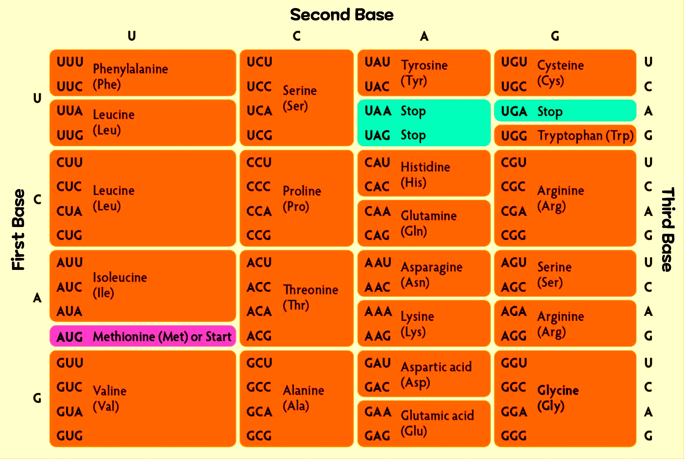 DNA는 단 4종의 염기로 단백질을 만들어 낼 수 있는데 이는 어떤 암호 방식을 사용하고 있기 때문이다. 단백질을 만들어내는 이 암호 방식에서는 염기 배열을 3개씩 나누어 읽어 나간다. mRNA의 염기 3개분의 배열인 '코돈'은 그 배열에 해당하는 '안티 코돈(Anticodon)'을 가진 tRNA와 결합하고 tRNA는 1종의 아미노산을 운반해 온다. 즉, 3개의 염기 배열이 1종의 아미노산을 지정하는 것이다. 염기는 4종이므로 4×4×4=64가지의 조합이 가능하므로 64가지의 암호가 만들어진다. 아미노산은 20종 이므로 몇 종류의 코돈이 하나의 아미노산을 지정하는 경우도 있다. 아래의 '표준 코돈표'를 보면 코돈이 어떤 아미노산을 지정하는지 알 수 있다. 코돈 중에는 아미노산 이외의 것을 지정하기도 한다. AUG는 메티오닌(Methionine)을 지정하는 코돈이지만, 단백질에 대한 번역 개시를 지정하는 '개시 코돈(Initiation Codon)'이기도 하다. 때문에 모든 단백질은 '메티오닌'으로 시작된다. UAA, UAG, UGA는 아미노산을 지정하지 않은 코돈으로, 번역의 종료를 의미하는 '종료 코돈(Termination Codon)'이다.