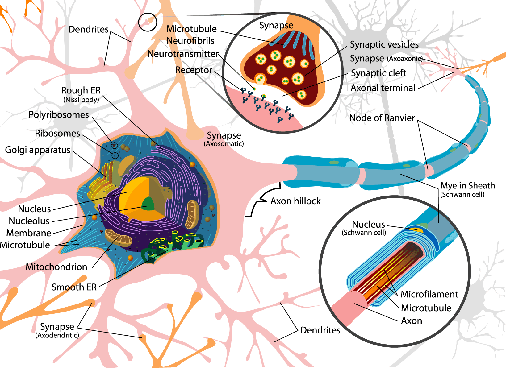 다는 아니지만, 현재 뉴런의 모양과 기능에 대한 기본적인 사항은 알려져 있다. 뉴런은 '세포체(세포의 본체)'와 거기에서 뻗은 수상돌기, 축삭으로 이루어진다. 세포체에는 핵과 미토콘드리아, 골지체 등 체세포와 공통인 부품도 있다. 미세소관은 화학 물질 등을 축삭 등으로 운반하는 역할을 한다. 수상돌기와 축삭은 다른 세포에는 없는 뉴런 특유의 것으로, 뉴런은 이들을 통해 신호를 다음 뉴런에 전한다. 우리가 어떤 물건을 만지거나 보면, 그 자극은 감각 기관에서 전기적인 신호로 뉴런에 전달된다. 수상돌기는 그 자극을 받아들이는 부분이고, 수상돌기는 이 신호를 세포체에서 축삭으로 전한다.