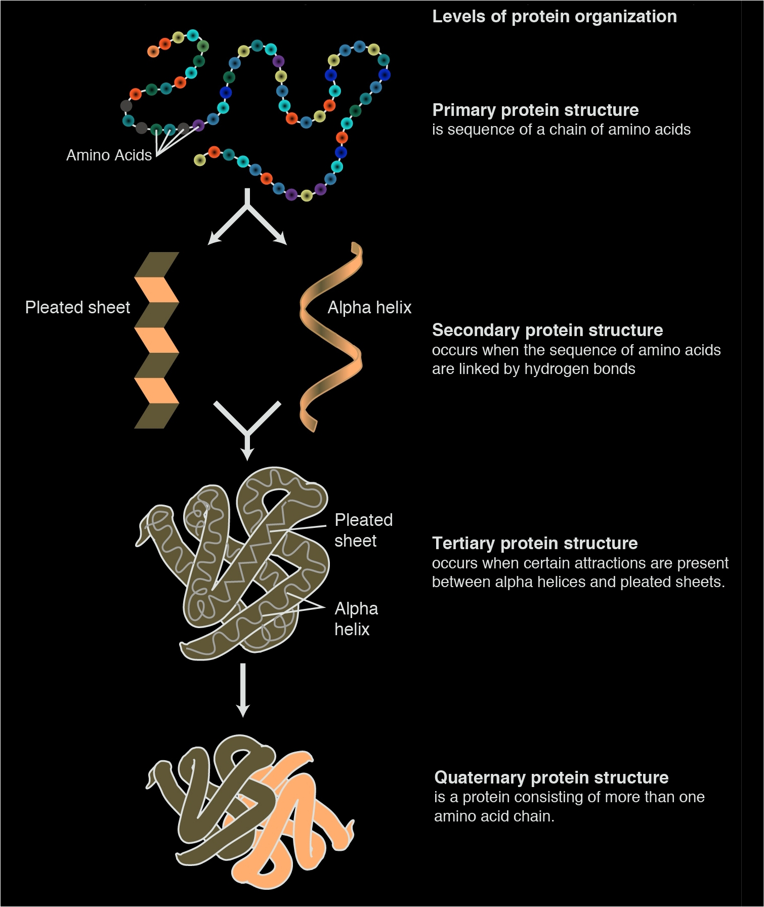 모든 단백질의 입체 구조는 '알파 헬리스(α Helices)와 '베타 스트랜드(β strand, Pleated sheet)'라는 2개의 최소 단위와 그 밖의 부분이 조합된 것으로 이루어져 있다. '알파 헬릭스'는 오른쪽으로 감긴 나선 구조, '베타 스트랜드'는 2개 이상 결합해 주름진 시트 모양의 구조이다. 이들 2개의 최소 단위의 어느 한쪽이 되는가, 아니면 어느 한 쪽도 되지 않는가는 아미노산의 배열에 의해 정해진다.