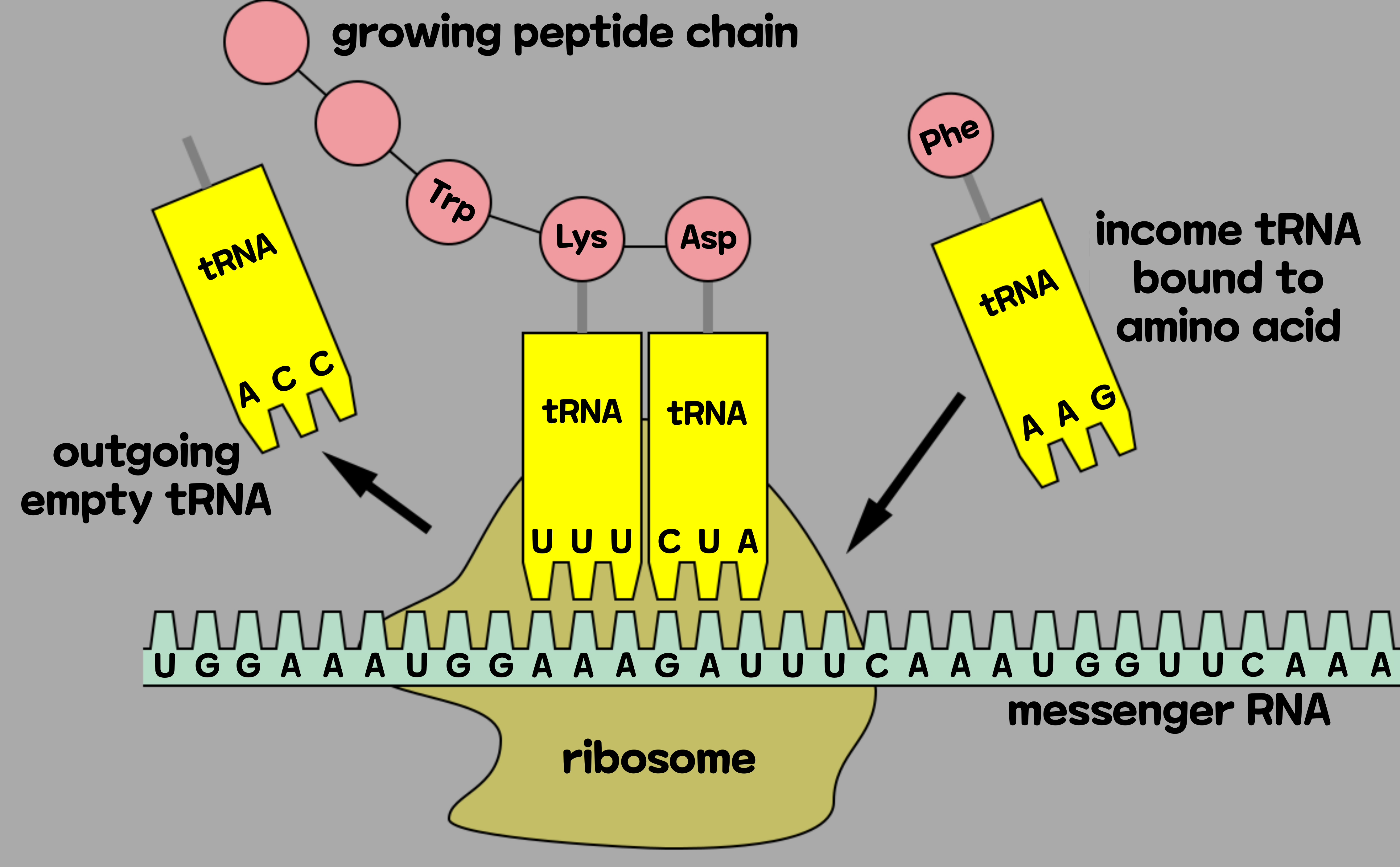 RNA의 염기는 4종이지만 아미노산은 20종이나 된다. RNA 염기는 3개의 문자가 1개의 아미노산에 대응된다. RNA의 암호와 아미노산의 대응은 모두 규명되었는데, 이 대응 관계를 표로 만든 것이 바로 '유전 암호표'이다. mRNA와 아미노산을 연결하는 것은 'tRNA'라는 분자다. tRNA는 분자 안에 2개의 중요한 부분이 있다. 하나는 아미노산과 결합하는 부분이고, 다른 하나는 암호인 mRNA의 염기 3개 문자(코돈)과 결합하는 부분인 '안티코돈'이다. tRNA는 특정 아미노산과 결합한 다음 리보솜으로 이동해 mRNA의 코돈과 결합한다. 리보솜이 mRNA 위를 움직여 나감에 따라 코돈이 지정하는 아미노산이 차례차례 운반되고, 그들이 염주처럼 이어져 나간다.