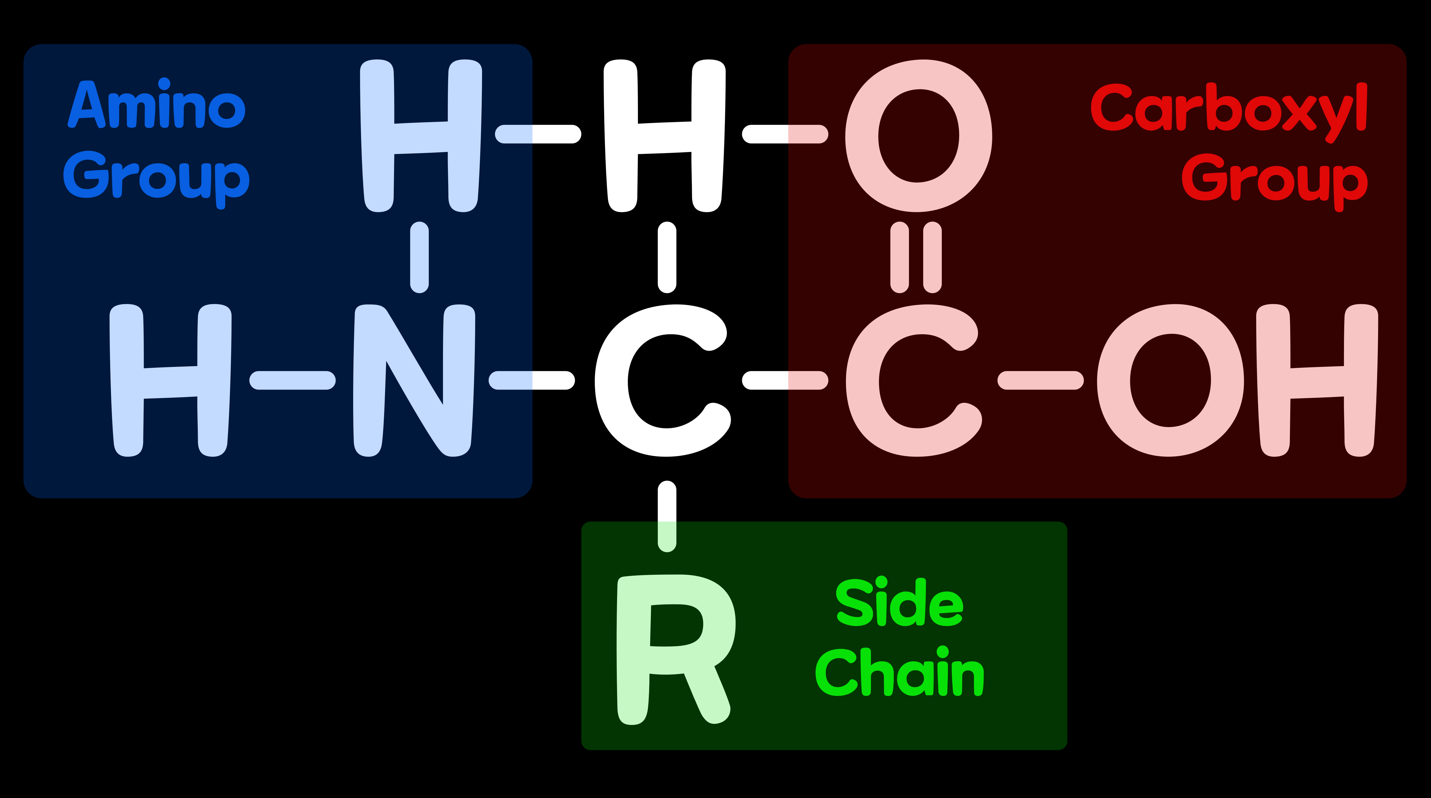 모든 아미노산에는 '아미노기(Amino Group)'와 '카복시기(Carboxyl Group)'와 'R기(Side Chain)'가 있다. (프롤린의 아미노기는 약간 구조가 다름) R기는 아미노산의 성질을 결정한다. 아미노산끼리 연결되어 단백질이 되었을 때도 'R기'의 특징은 단백질의 성질에 영향을 미친다. 예컨대, 물과 친하기 어려운 R기가 연속하는 부분은 물과 반발해 단백질의 안쪽으로 접혀들기 쉽다. 단백질의 입체적인 구조는 주로 R기에 의해 정해진다. 'R기'는 20종의 아미노산에서 서로 다르며, 'R기'가 각 아미노산의 성질을 결정한다.