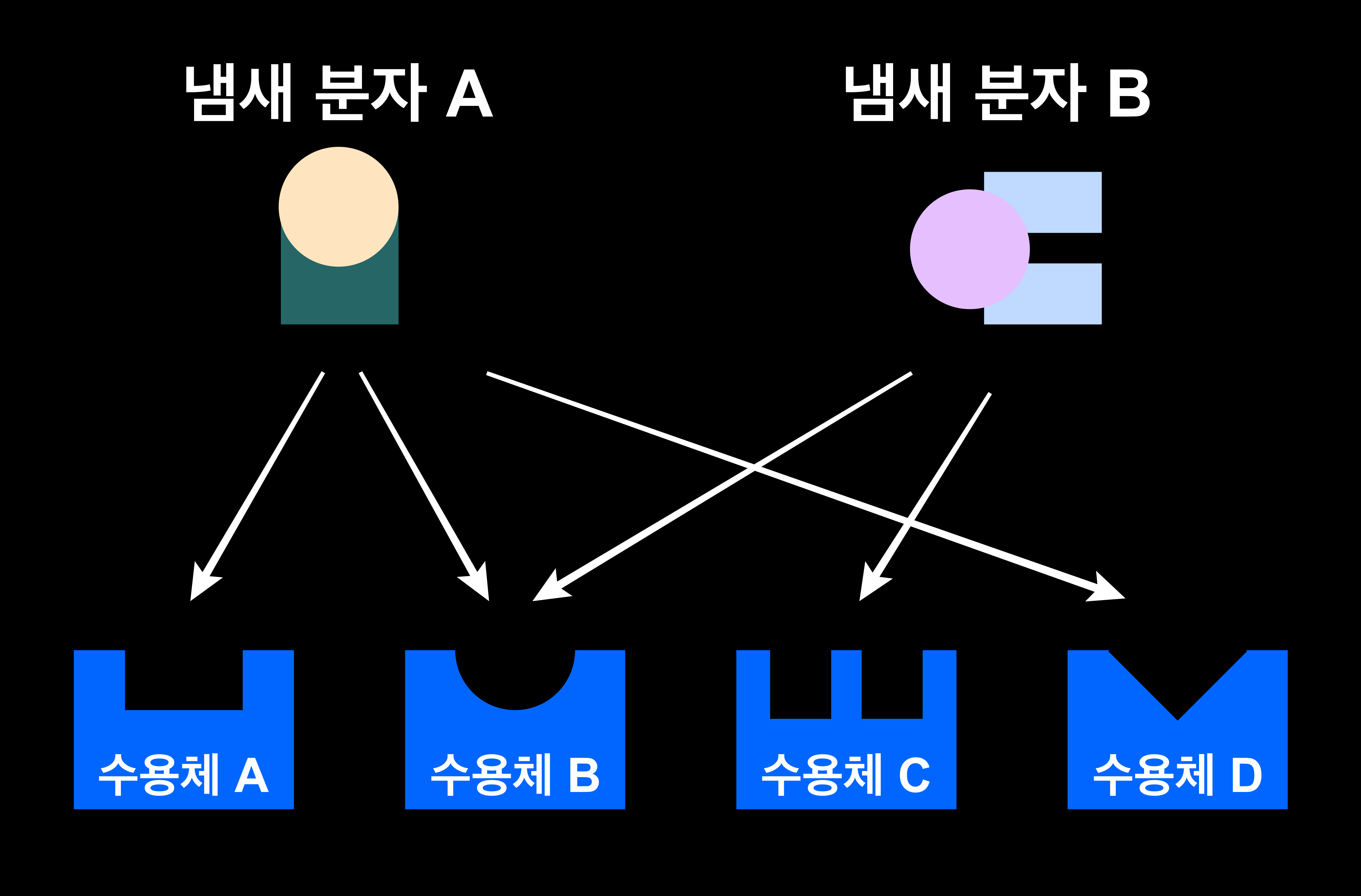 아래의 그림은 수용체의 조합을 통해 냄새 분자를 식별하는 구조를 도식적으로 나타낸 것이다. '냄새 분자 A'는 분자의 어딘가가 '수용체 A', '수용체 B', '수용체 D'에 딱 들어맞으므로 반응한다. 한편, '냄새 분자 B'는 분자의 어딘가가 '수용체 B', '수용체 C'에 딱 들어맞으므로 반응한다. 수용체 B만으로는 '냄새 분자 A'와 '냄새 분자 B'를 구별할 수 없지만, 수용체의 조합을 비교하면 '냄새 분자 A'와 '냄새 분자 B'를 구별할 수 있다.