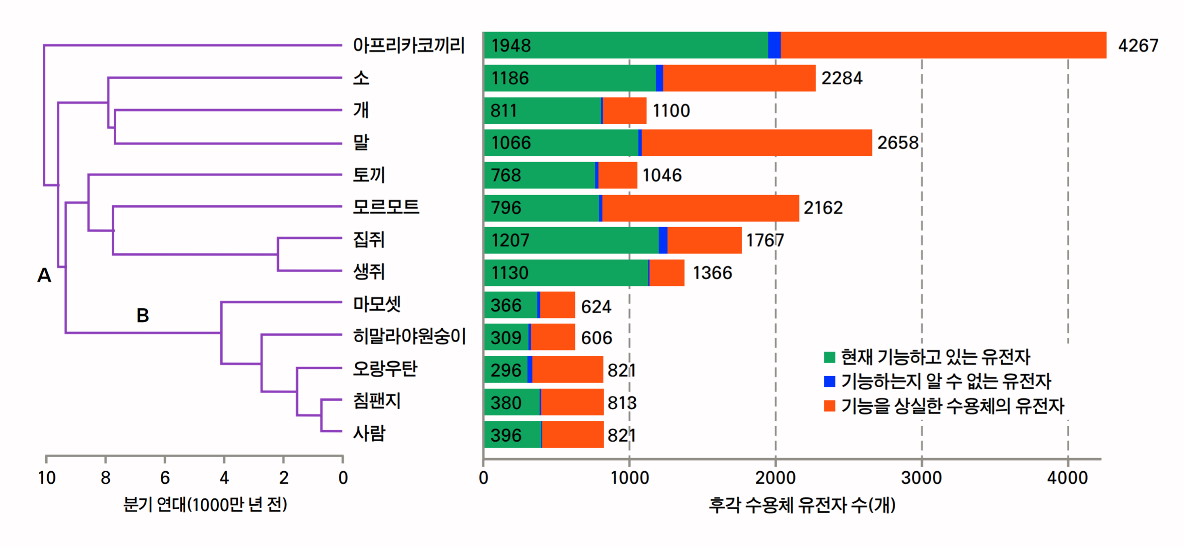 후각 수용체는 DNA에 있는 설계도를 바탕으로 만들어지기 떄문에 DNA를 조사하면, 그 종의 후각 수용체의 종류를 알 수 있다. 초록색 부분은 현재 기능하고 있는 수용체의 유전자의 수를, 주황색은 기능을 잃은 수용체의 유전자의 수를, 파란색은 기능하고 있는지 없는지 알 수 없는 유전자의 수를 나타낸다.