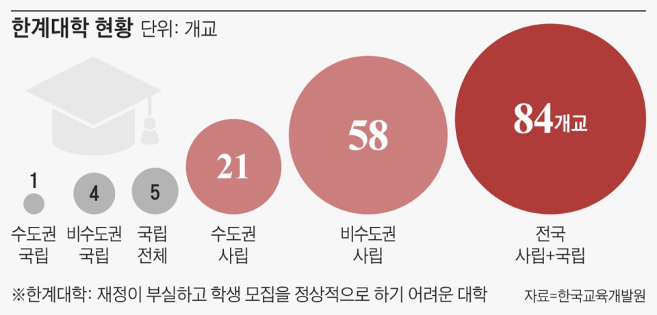 한국의 대학들도 사정은 비슷하다. 한국의 대학들은 정부의 지원을 바라고 있지만 정부 지원에도 한계가 있으며 청년은 줄어들고 있으므로, 수많은 대학들이 파산할 것은 너무나 당연한 일이다. 그리고 한국에는 2021년 기준 약 400개의 대학들이 있는데, 호주에 40개의 대학이 있는 것에 비하면 그 수가 너무 많다. 게다가 한국에 있는 상당수의 대학이 형편없는 부실 대학이다. 아래의 그림은 '한국교육개발원(KEDI: Korean Educational development Institute)'에서 2021년에 조사한 '한계대학 현황'을 나타낸 것이다. '한계대학'이란 재정이 부실하고 학생 모집을 정상적으로 하기 어려운 대학을 말한다.