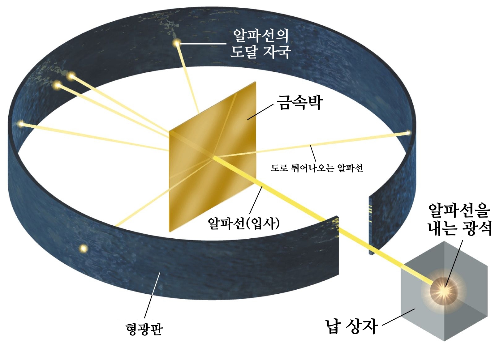 '러더퍼드'는 금속박에 '알파선'을 비추고, 그 뒤 알파선이 어떻게 나아가는지 조사했다. '알파선(α-ray)'이란 우라늄 등의 방사성 물질에서 나오는 방사선의 일종으로, '양전기'를 띤 '알파 입자(α-particle)'라는 입자의 흐름이다. 알파 입자가 부딪히면 빛을 내므로, 어디에 도달했는지 알 수 있다. 러더퍼드는 '알파 입자'가 양전기를 띠고 있으므로, 원자 속에 있는 양전기와 서로 반발되어 궤도가 바뀔 것으로 예상했다. 즉, 궤도의 변화를 알아내서 원자 속에 양전기가 어떻게 분포하고 있는지 알아내려고 한 것이다. 실제 실험에서는 알파 입자의 다수가 직진을 했고 크게 진로가 휘어진 입자들도 있었다. 거의 정면으로 튀어나오는 입자도 있었다.