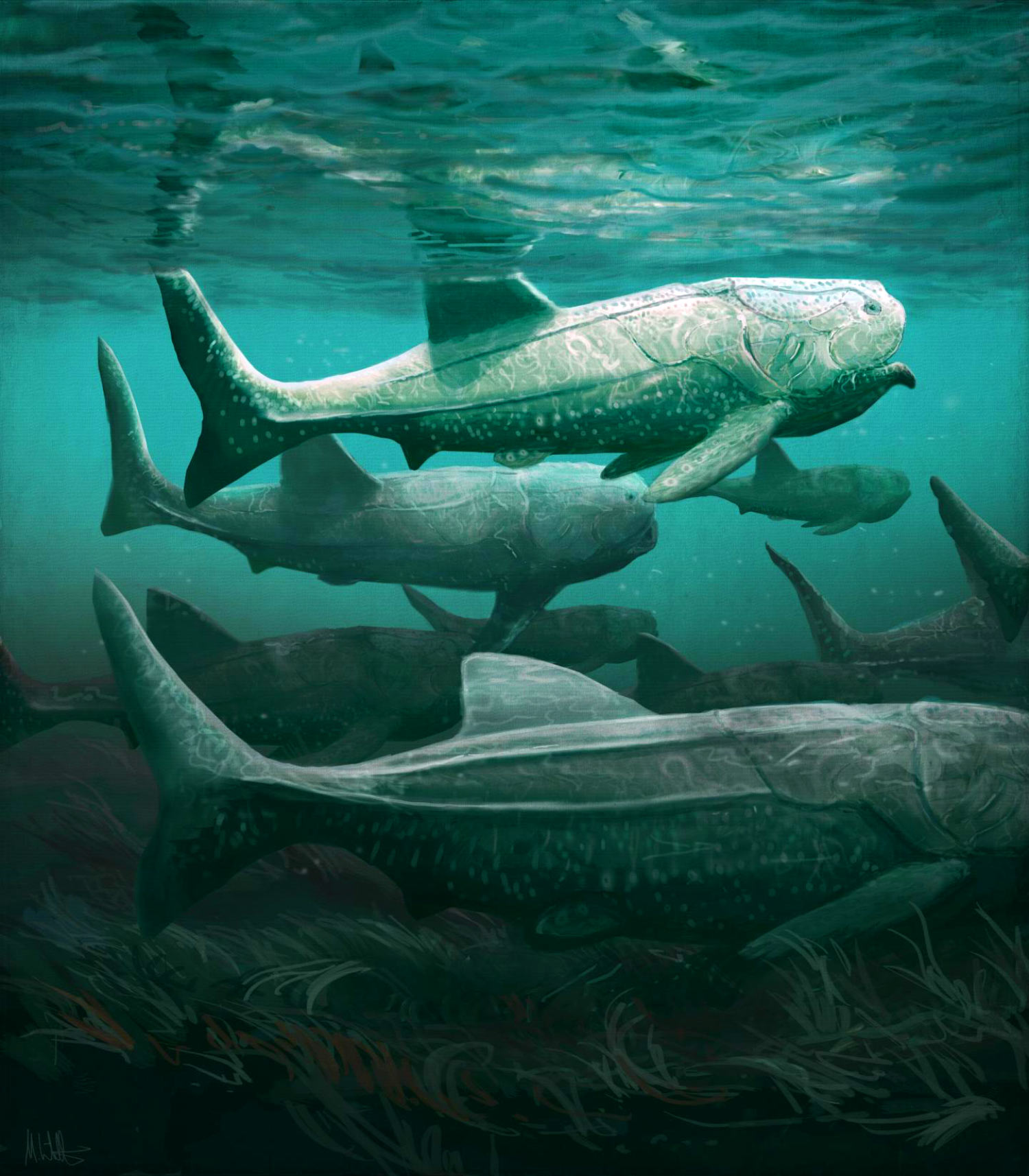하지만 4억 2000만 년 전에 시작된 데본기에 들어서는, 어류의 번성이 가장 뚜렷해졌다. 그래서 '데본기'는 어류의 시대라고 불리기도 한다. 어류의 번성에는 '턱의 탄생'이 큰 역할을 했다. 턱은 효율적으로 상대를 포식할 수 있게 해 주었으며, 그 결과 어류는 급속히 다양해지고 대형화했다. 이전까지 어류는 큰 것이라도 수십 cm를 넘지 않았지만, 이 시대에는 몸길이가 7m인 어류도 있었다. 이때 해양의 생태계의 왕좌를 차지한 어류는 오늘날까지 생태계의 왕좌를 유지하고 있다.