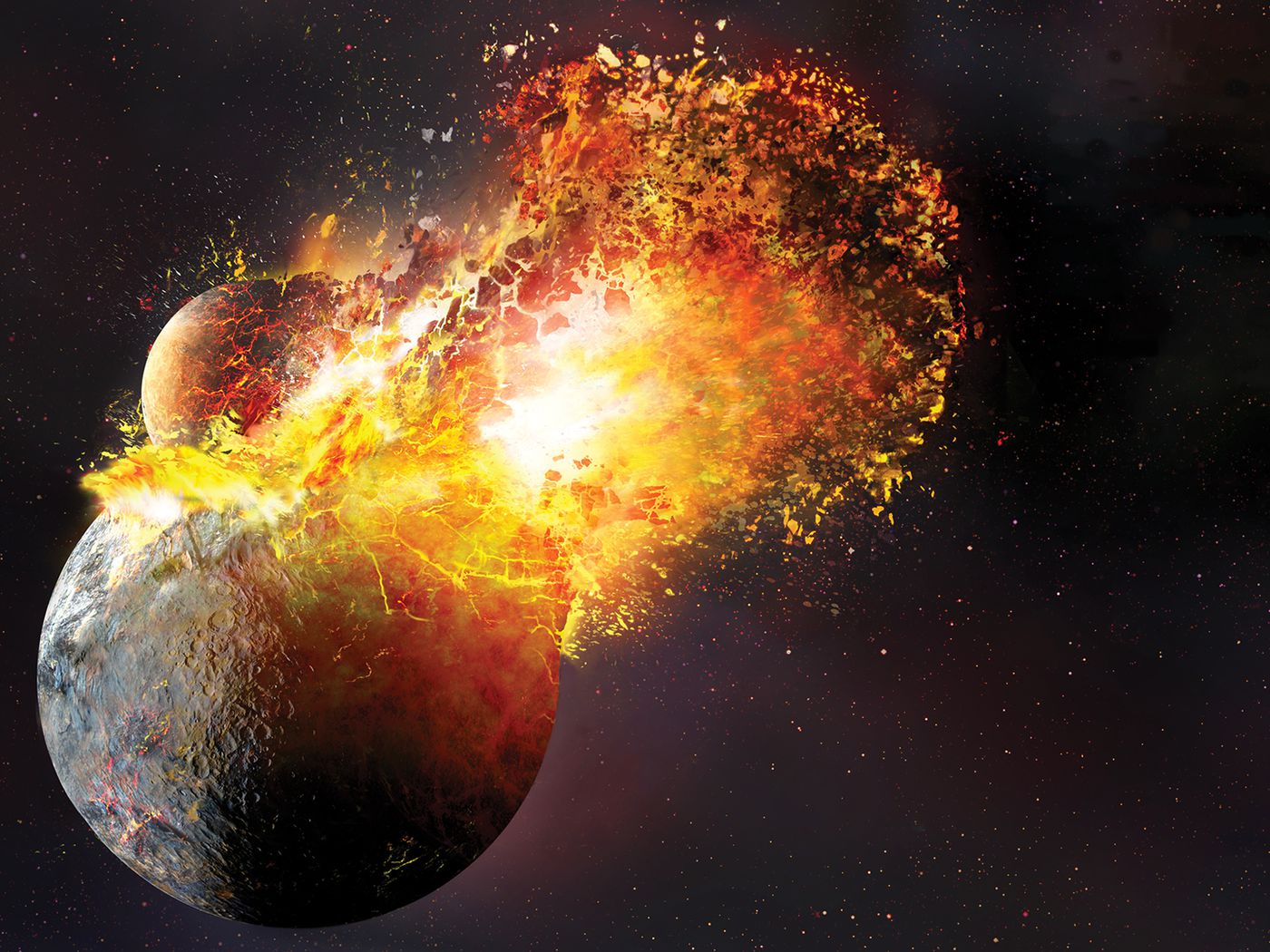 지구가 탄생하고 약 4000만 년 후에, 반지름 약 3400km 정도 되는 크기의 행성 즉, 현재의 '화성(Mars)'과 같은 크기의 행성과 충돌하였다. 이 충돌로 인해 흩어진 파편은 지구의 중력에 이끌려 지구의 궤도를 돌게 되었고, 서로의 중력으로 끌어당겨져 다시 뭉쳐졌다. 이렇게 해서 생긴 게 바로 '달(Moon)'이다. 달을 만들어 낸 이 천체의 충돌을 '자이언트 임팩트(Giant Impact)'라고 부른다.