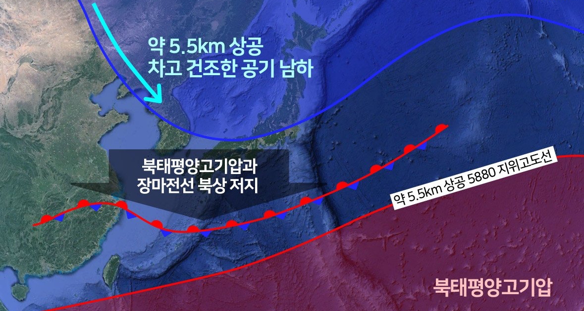 우리나라는 6월 상순부터 7월 하순에 걸쳐 긴 비가 계속되는 '장마철'에 들어선다. 이 시기에 '오호츠크해 고기압'에서 불어오는 바람과 '북태평양 고기압'에서 불어오는 바람이 충돌하기 때문이다. 이렇게 생긴 충돌의 경계를 '장마 전선(seasonal rain front)'이라고 한다. 장마 전선은 동서 방향으로 횡단하며, 때로는 5000km 이상 길게 뻗는 경우도 있다.