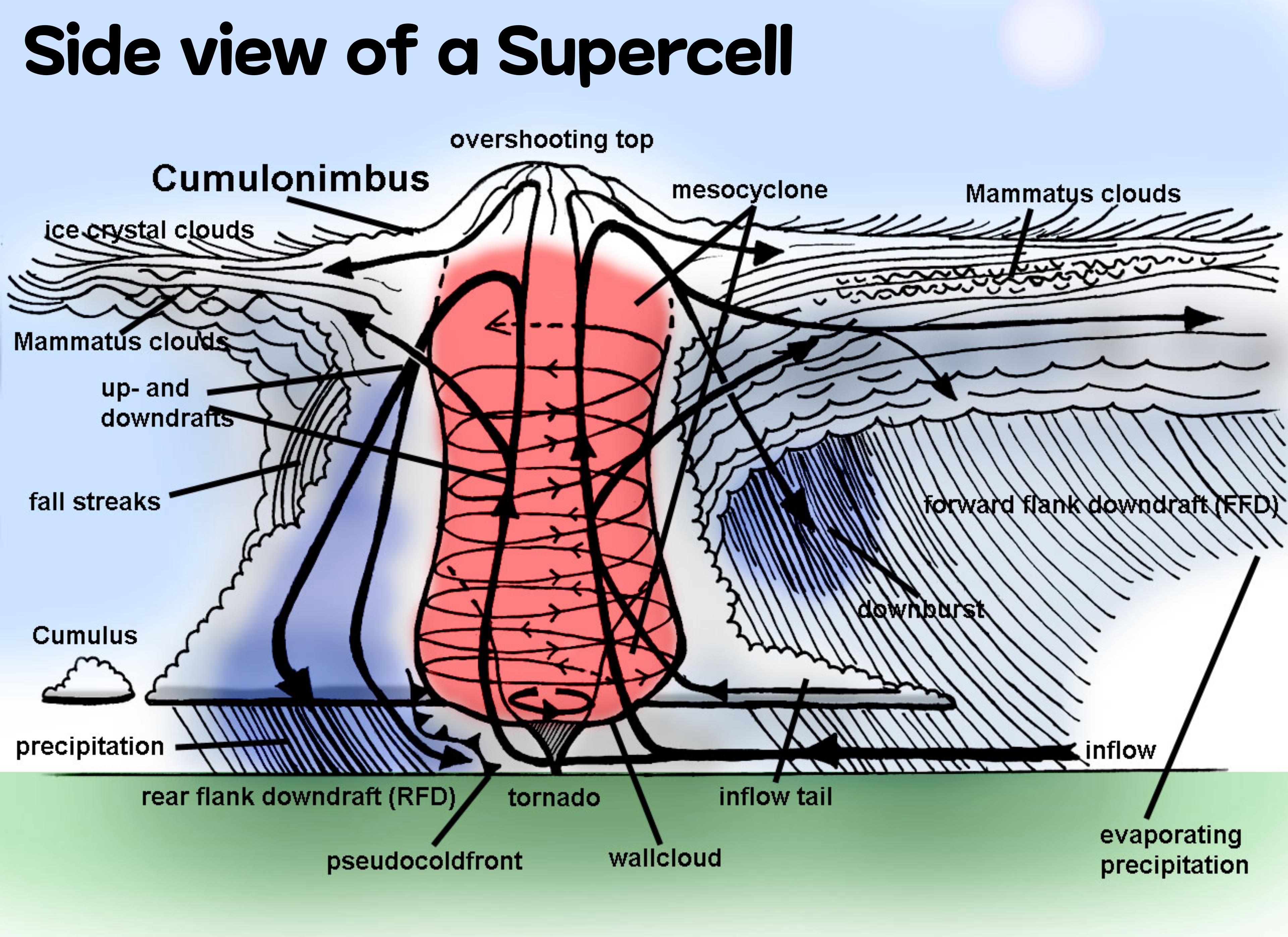 먼저 지상에서 바람이 서로 부딪치는 등의 이유로 소용돌이가 생긴다. 그 소용돌이가 '메소사이클론' 아래쪽에 있는 상승기류에 의해 아래 위로 잡아지는 등의 이유로 지름 수십~수백 m 정도의 가늘고 강한 소용돌이로 발달하는 경우가 있다. 이것이 '토네이도(tornado)'이다. 거대한 토네이도의 풍속은 때로 초속 100m를 넘는다. 이 정도가 되면 '토네이도'의 진로에 있는 주택이 파괴되는 것은 물론이고 자동차 등도 날아갈 정도의 위력을 발휘한다. 슈퍼셀은 심한 비와 낙뢰, 대량의 우박, 돌풍 등을 동반하는 위험한 구름이다.