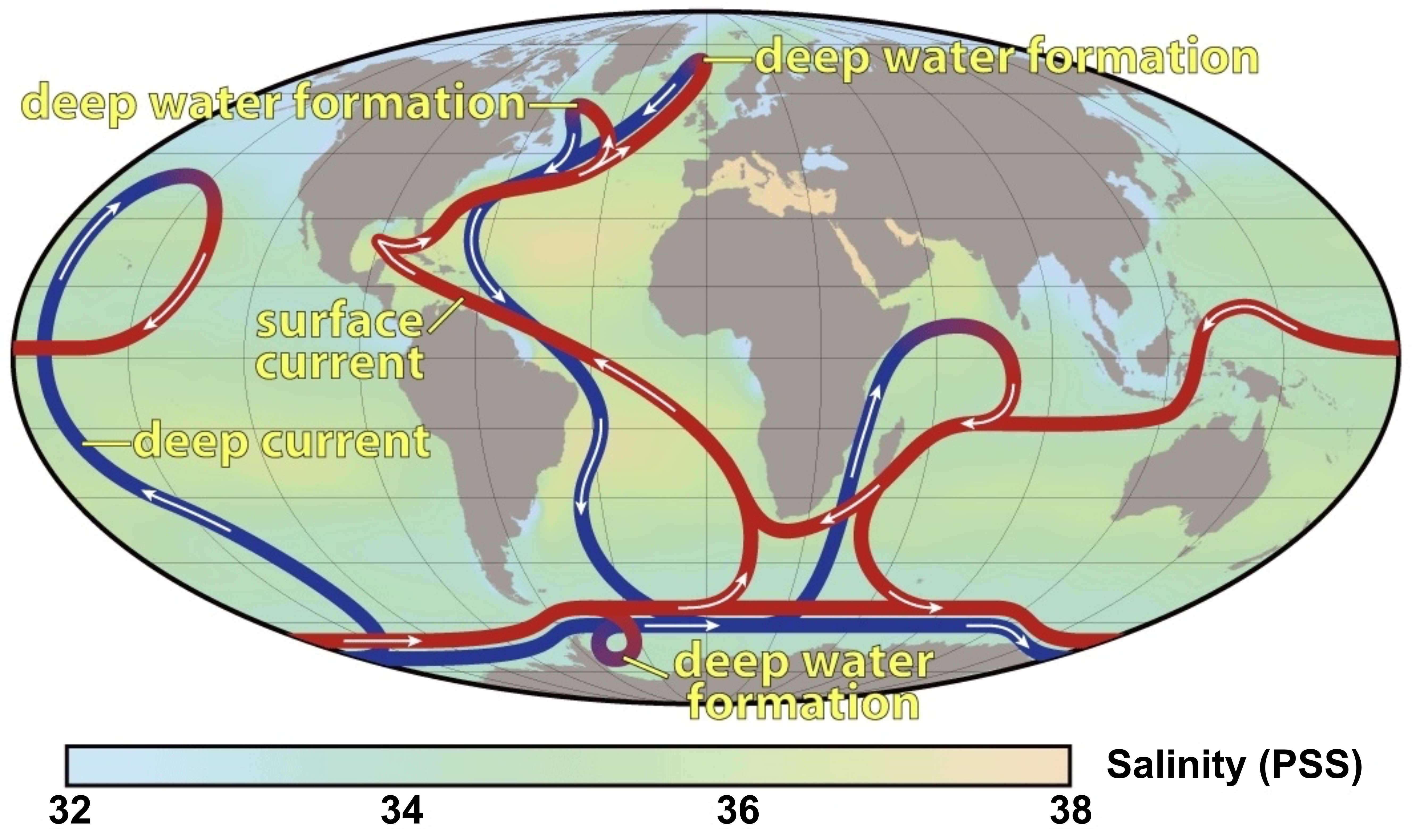- 심층 해류는 서서히 표층 부근으로 돌아온다: 심해로 가라앉은 바닷물은 '심층 해류'가 되어 천천히 전 세계의 심해를 이동한다. 그 속도는 초속 약 몇 cm 정도로, 평균적인 표층의 해류와 비교하면 10분의 1 정도에 지나지 않는다. '심층 해류'는 각각 대양의 해저를 천천히 흐르는 사이에 그 조금 위에 있는 약간 따뜻한 바닷물에 의해 데워지거나, 밀도가 조금씩 작아지면서 서서히 표층 부근으로 돌아온다.