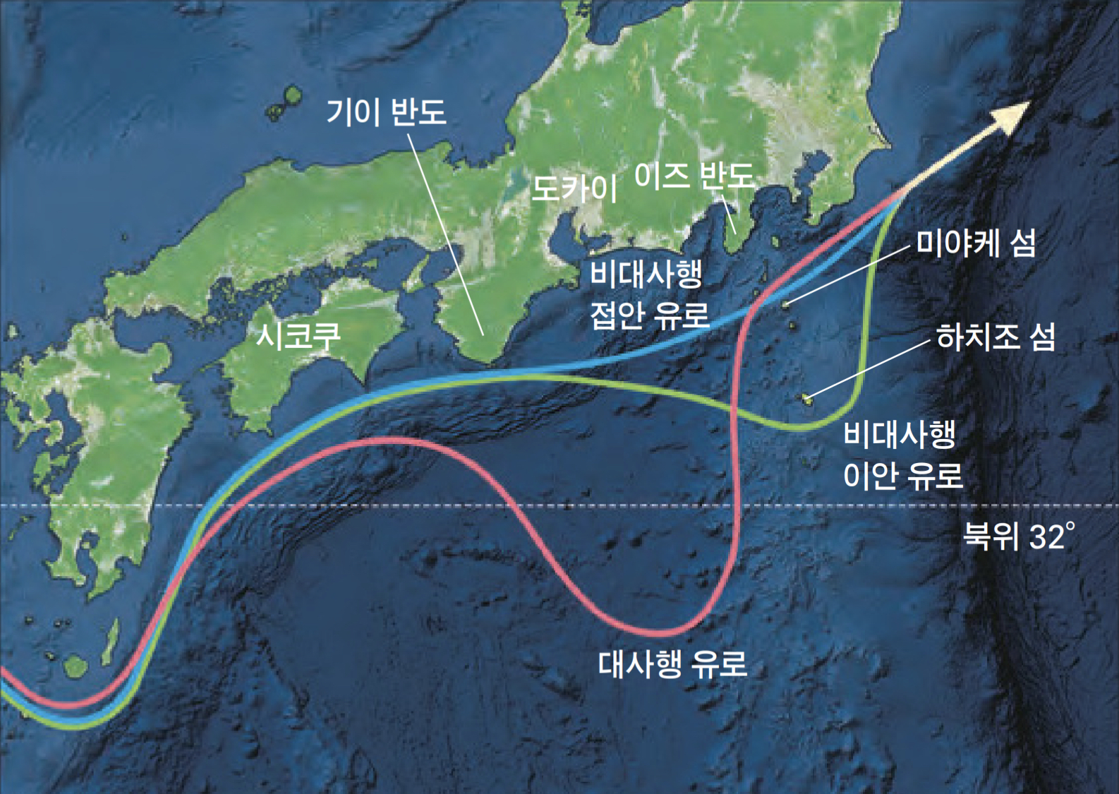 - 비대 사행 이안 유로: 두 번째는 일본 중부 지방의 '기이 반도(일본 긴키 지방의 남부에 있는 일본 최대의 반도)'의 '난바다(육지에서 멀리 떨어진 바다)' 부근에서부터 해안 멀리 '하치조섬 남쪽을 우회하는 유로이다. 이것을 '비대 사행 이안 유로'라고 부른다.