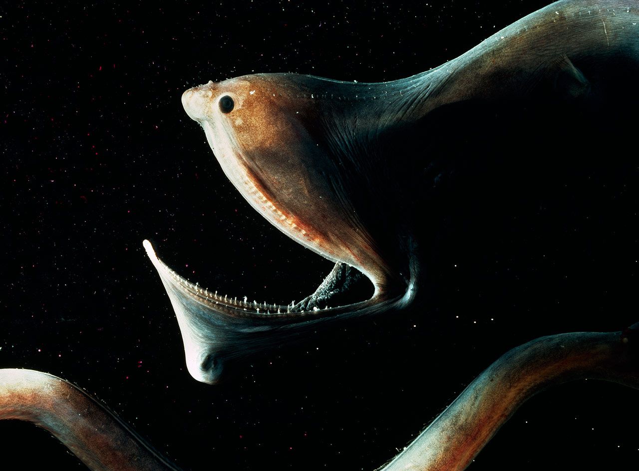 '꿀꺽장어(Gulper Eel)'의 기묘하게 보이는 이 형태는 먹이가 적은 바다의 약간 깊은 곳에서 생활하는 데 적응한 전형적인 것이다. 커다란 입의 테두리에는 크고 작은 이빨들이 가득하고, '아감딱지(경골어류의 머리 양쪽에 있어 아가미를 덮어 보호하고 물이 드나들게 하는 넓적한 뼈로 된 뚜껑)'는 사라졌으며 눈알도 작다. 비늘이 없고, 신축성이 좋은 복부는 주식인 큰 물고기를 삼켜도 견딜 수 있다. 온몸이 소화 기관 같은 이들에게는 가늘고 낀 꼬리와 복잡한 발광기가 발달된 것처럼 보이지만, 그 기능은 아직 자세히 알려지지 않았다.