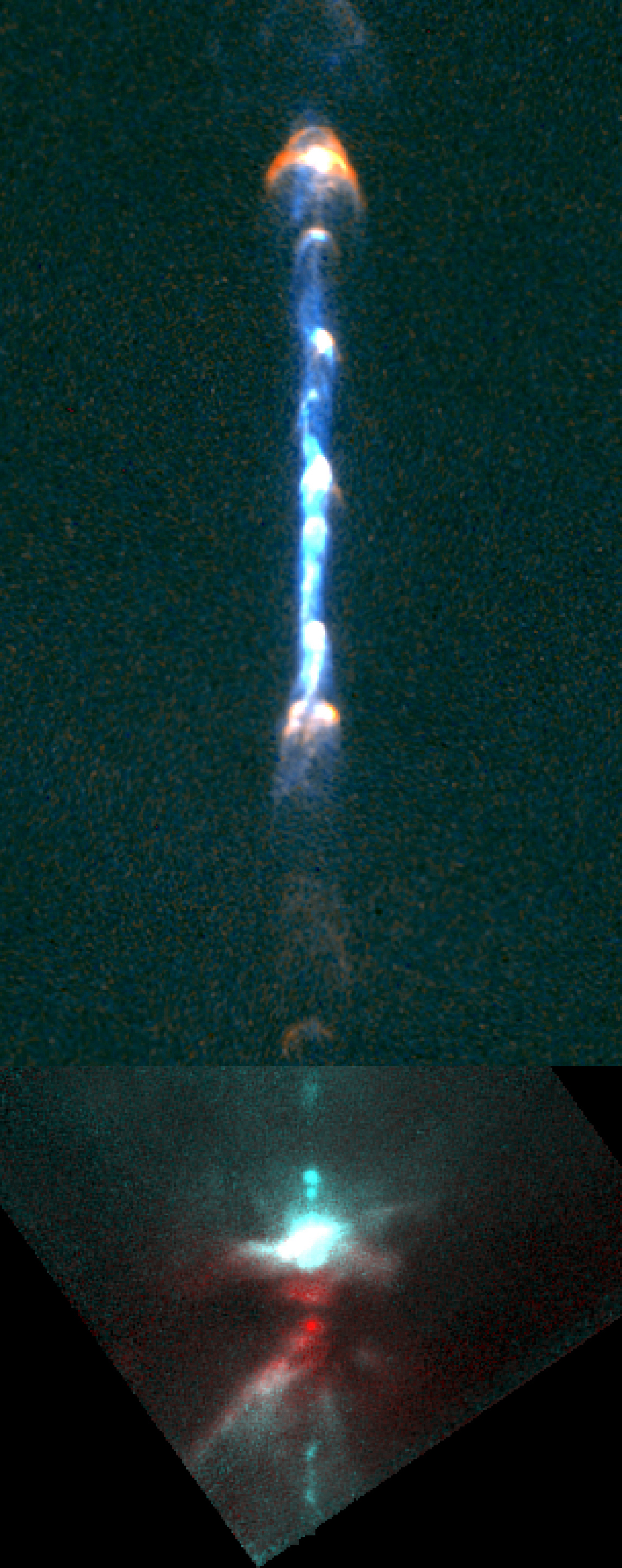 아래의 사진은 오리온자리에 있는 오리온 B 분자운의 L1617 암흑운에 있는 '허빅 아로 111(Herbig-Haro 111)'이라는 천체이다. 허비 아로'가 빛나 보이는 이유는 갓 태어난 별이 방출하는 제트가 주위의 물질과 충돌했을 때 생기는 충격파가 빛나 보이기 때문이다. 위쪽 부분은 가시광선을 포착한 것으로, 12광년이나 되는 거대한 제트가 촬영되어 있다. 실제로는 사진 바깥에도 제트가 뻗어 있을 것으로 생각되지만, 앞쪽 물질에 가려서 가시광선으로는 보이지 않는다고 생각된다. 아래쪽 부분은 적외선으로 촬영한 것이다. 제트의 근원을 에워싸듯 어둡게 촬영된 부분이 '원시 행성계 원반'으로 그 일부는 붉게 보인다. 가스나 먼지로 이루어지는 '원시 행성계 원반'은 거대한 도넛 모양이며, 별이나 행성을 만드는 근원이 된다.
