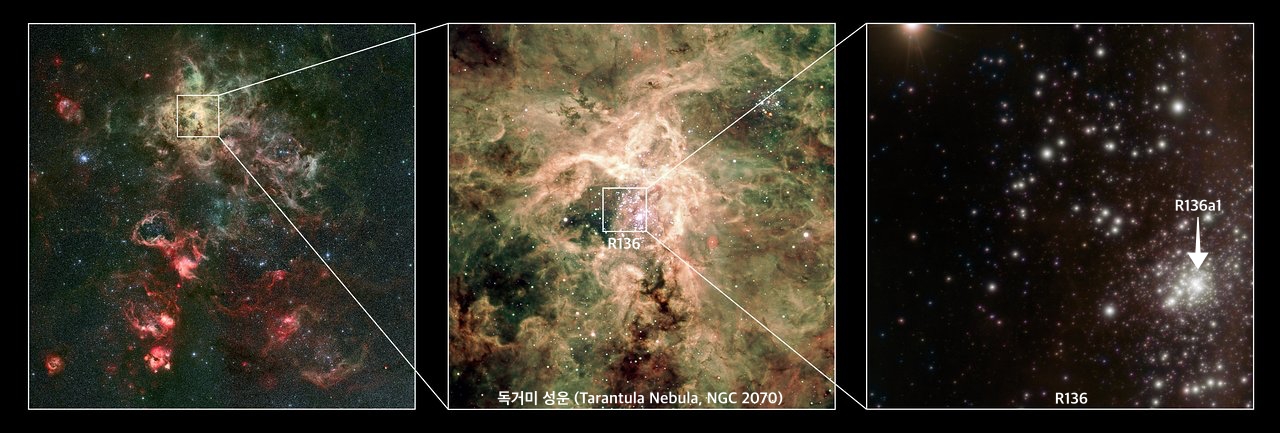 '대마젤란 은하(Large Magellanic Cloud)' 안에 있는 'R136'는 나이가 약 170만 살인 어린 별의 집단으로, 밝은 대질량별이 많이 보인다. 화살표의 끝에 있는 항성 R136a1은 밝기가 태양의 약 1000만 배, 질량이 태양의 265배나 되는 대질량별로, 2010년 7월 30일 발표 당시에, 관측 사상 밝고 질량이 큰 항성으로 기록되었다. 나이가 어릴 때의 R136a1은 질량이 태양의 320배였으리라 생각된다. R136a1은 대질량이므로, 수명이 짧아 이미 일생의 절반을 마친듯 하다. 질량이 태양의 140~300배인 항성은 불안정해서, 최후에 아무것도 남지 않을 것으로 생각된다.