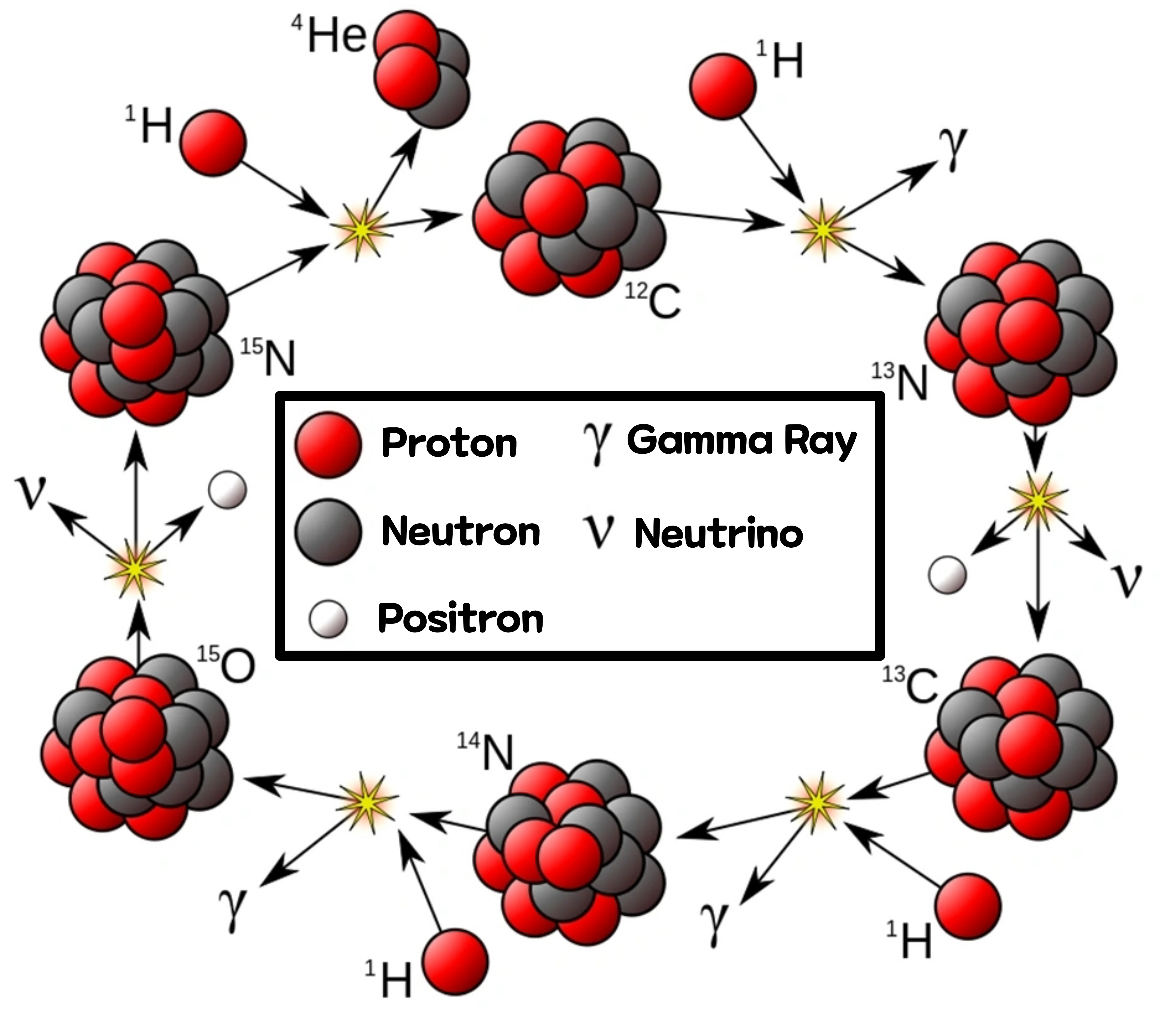 태양 이외의 별도 빛나는 메커니즘은 태양과 다르지 않지만, 내부 구조는 약간 다르다. 태양의 1.5배 이상인 별은 내부 구조가 중심핵과 복사층으로 이루어져 있다. (태양은 중심핵, 복사층, 대류층으로 이루어져 있음) 태양 질량의 1.5배 이상이 별에서는 중심핵에서 'CNO 사이클(CNO Cycle)'이라고 불리는 핵융합 반응이 이루어진다. 탄소, 질소, 산소가 서로 변환해 4개의 수소 원자핵에서 1개의 헬륨 원자핵이 만들어진다. CNO 사이클은 온도에 민감하게 반응하기 때문에, 고온인 중심핵의 중심부에서 이루어진다.