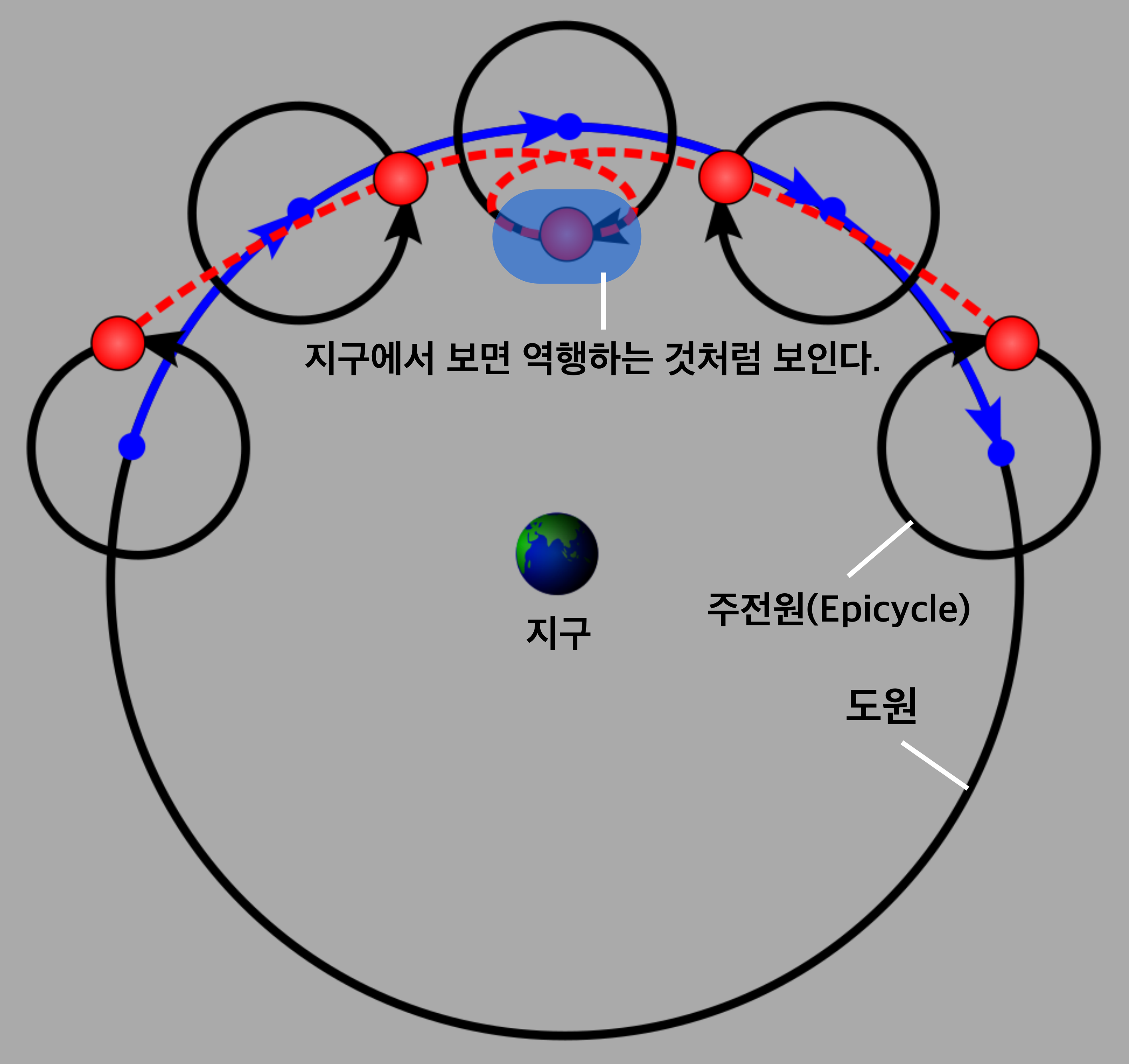 '프톨레마이오스'는 이들 현상을 이론적으로 분석하였고, 행성이 '도원(지구의 주위를 동쪽을 향해 운동하는 커다란 원형의 궤도)' 상에 '주전원(Epicycle)'이라는 작은 원형 궤도를 생각했다. 주전원의 중심은 궤도의 위를 동쪽을 운동한다. 이들 두 운동의 합성에 의해 행성의 역행이 생긴다고 설명한 것이다. 그리고 수성과 금성에 대해서는 주전원의 중심이 항상 지구와 태양을 잇는 직선 위에 있다고 하면, 이들 행성이 새벽이나 초저녁에만 나타나는 현상도 설명할 수 있다.